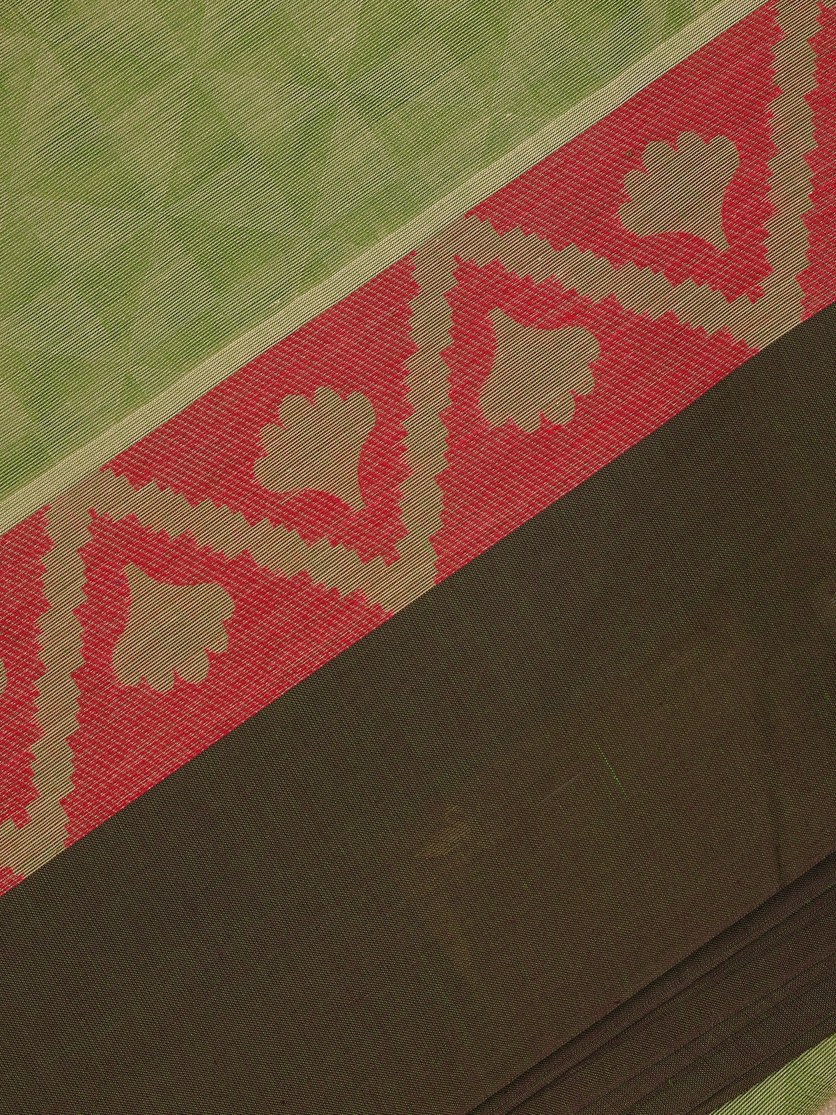 The saree features a subtle geometric woven pattern across its soft green base, giving it a touch of traditional artistry. Its dual border in contrasting pink and brown tones adds depth and sophistication, making it a versatile choice for both casual and semi-traditional occasions.