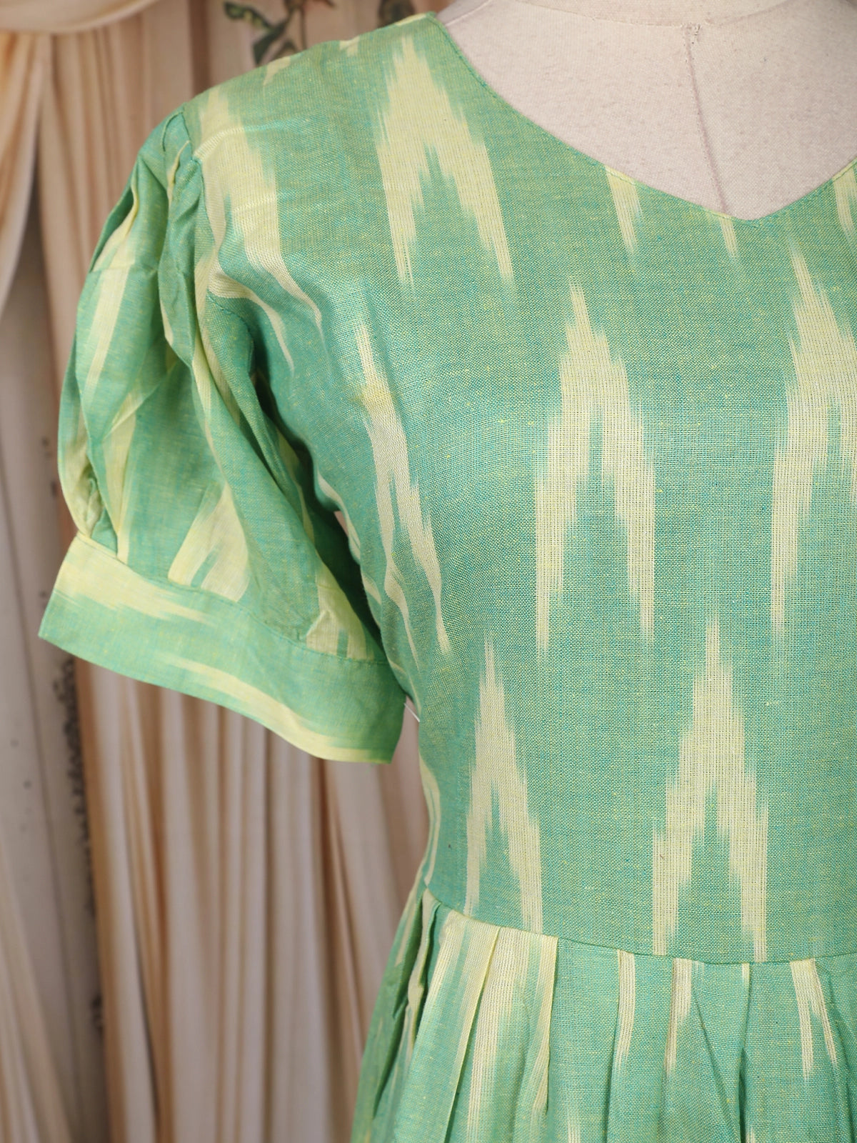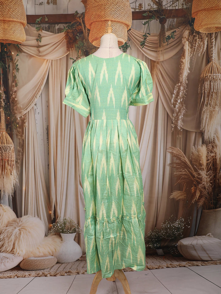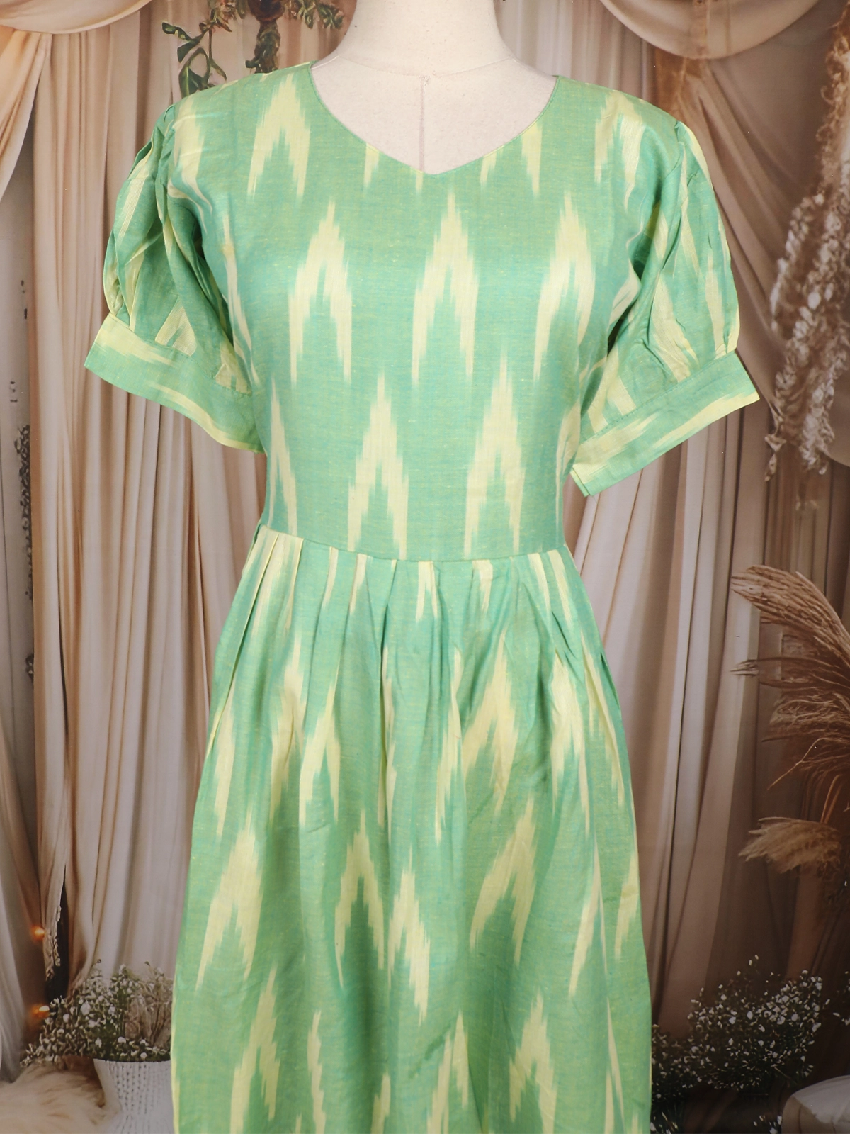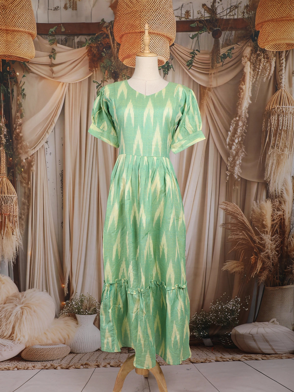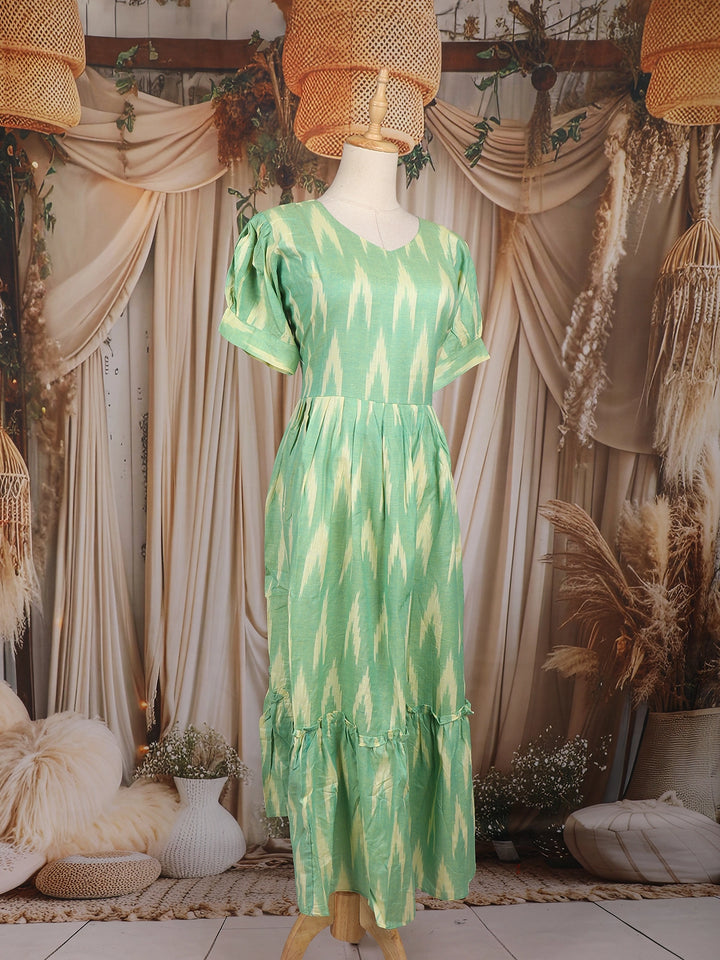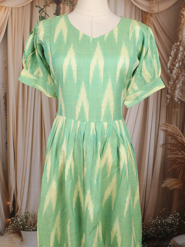 The design features a fit-and-flare silhouette with a gathered waistline that adds gentle volume and flow. The all-over Ikat weave pattern in soft green and ivory tones brings a serene and refreshing vibe. The round neckline paired with puffed half sleeves and turned-up cuffs lends a youthful, contemporary edge. A subtle tiered detailing near the hemline adds texture and movement, making this kurti an ideal choice for casual days, work wear, or relaxed weekend outings.