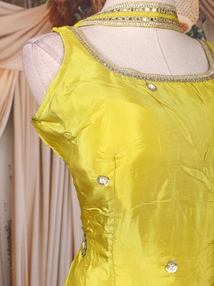 The square neckline and sleeveless silhouette create a graceful and contemporary look, perfectly complemented by the shimmering texture of tissue silk. The embroidery extends elegantly across the bodice and hemline, infusing the ensemble with festive radiance.