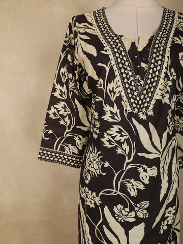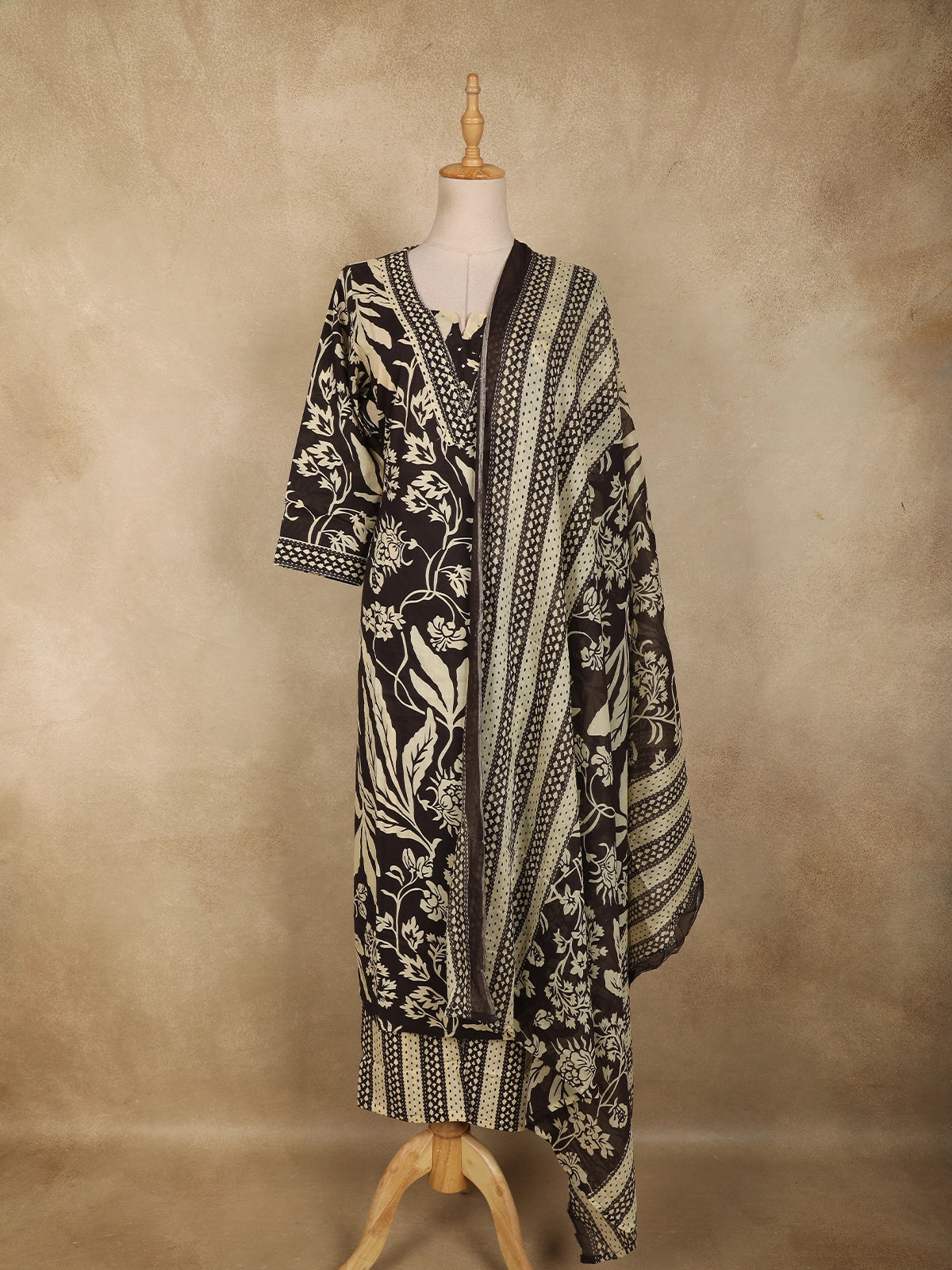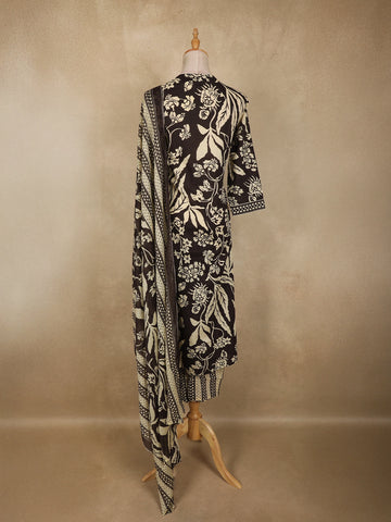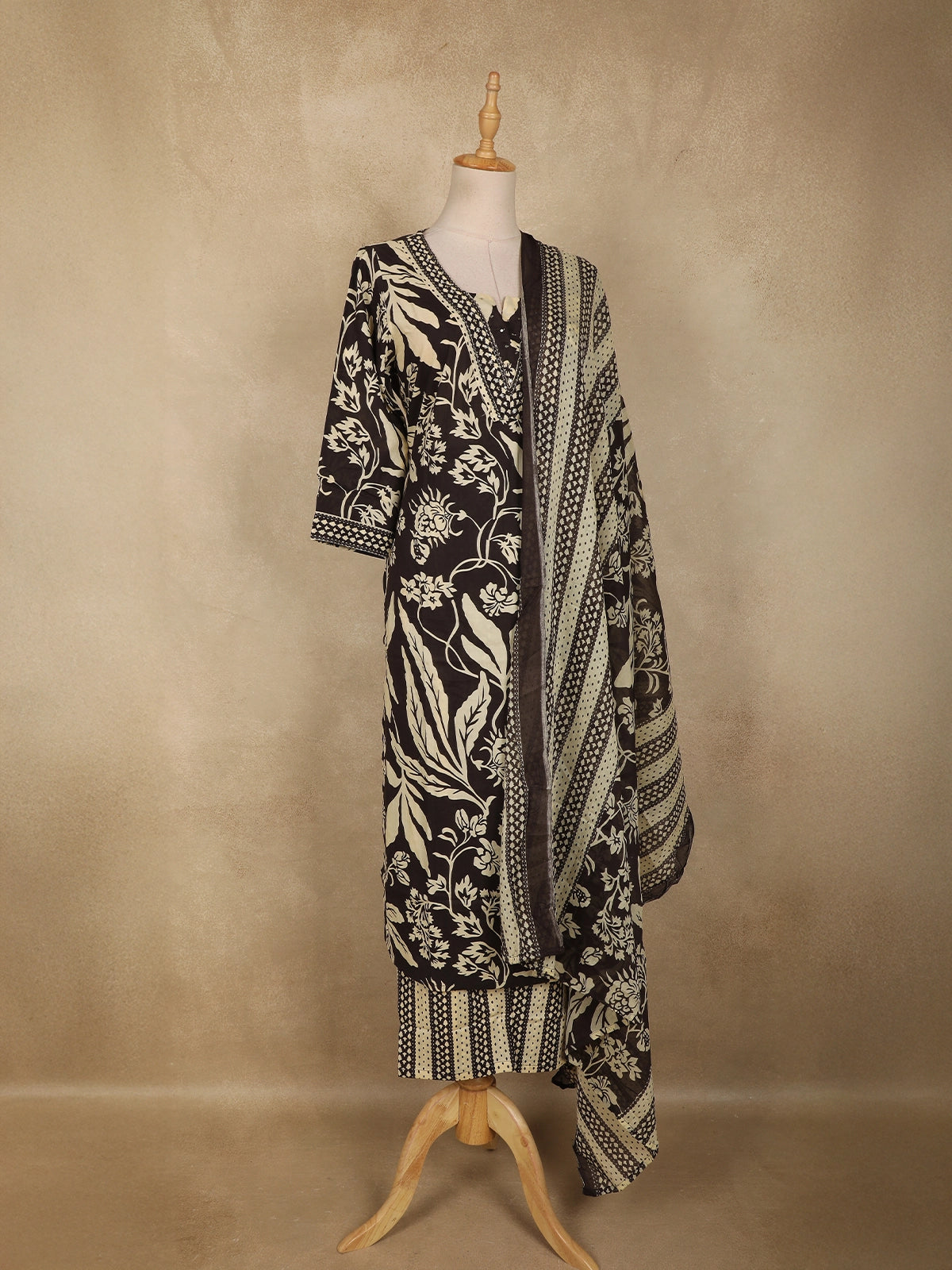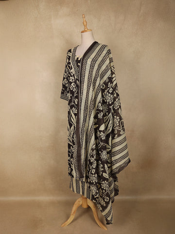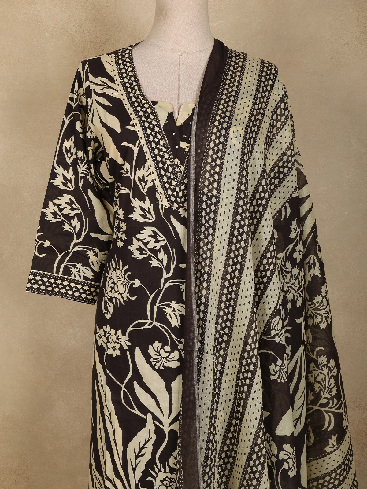 Paired with a matching printed dupatta, adorned with coordinated motifs and contrast border detailing, this ensemble completes the look with refined elegance. Soft, lightweight, and easy to drape, the dupatta adds a graceful flow and elevates the overall aesthetic.