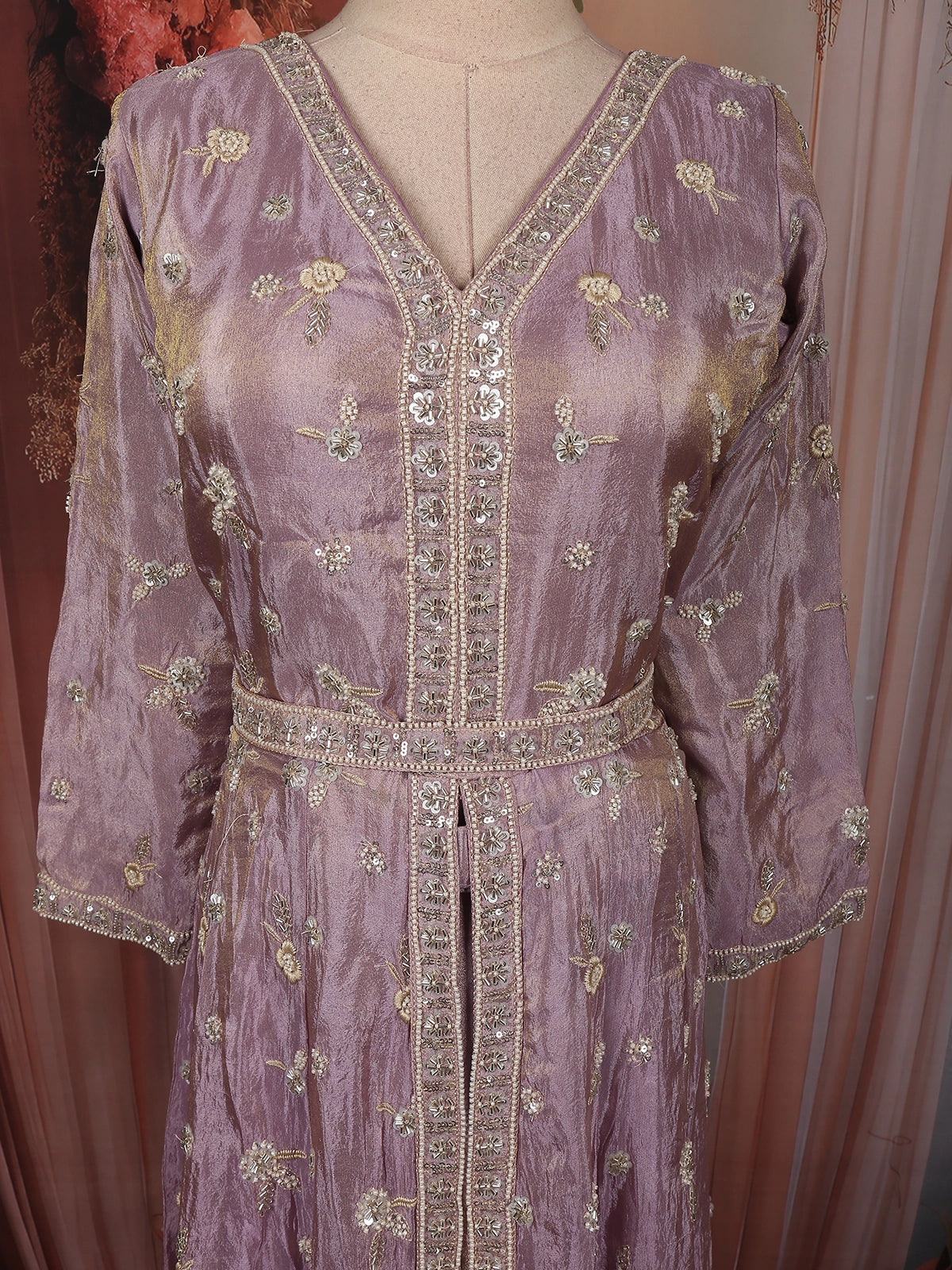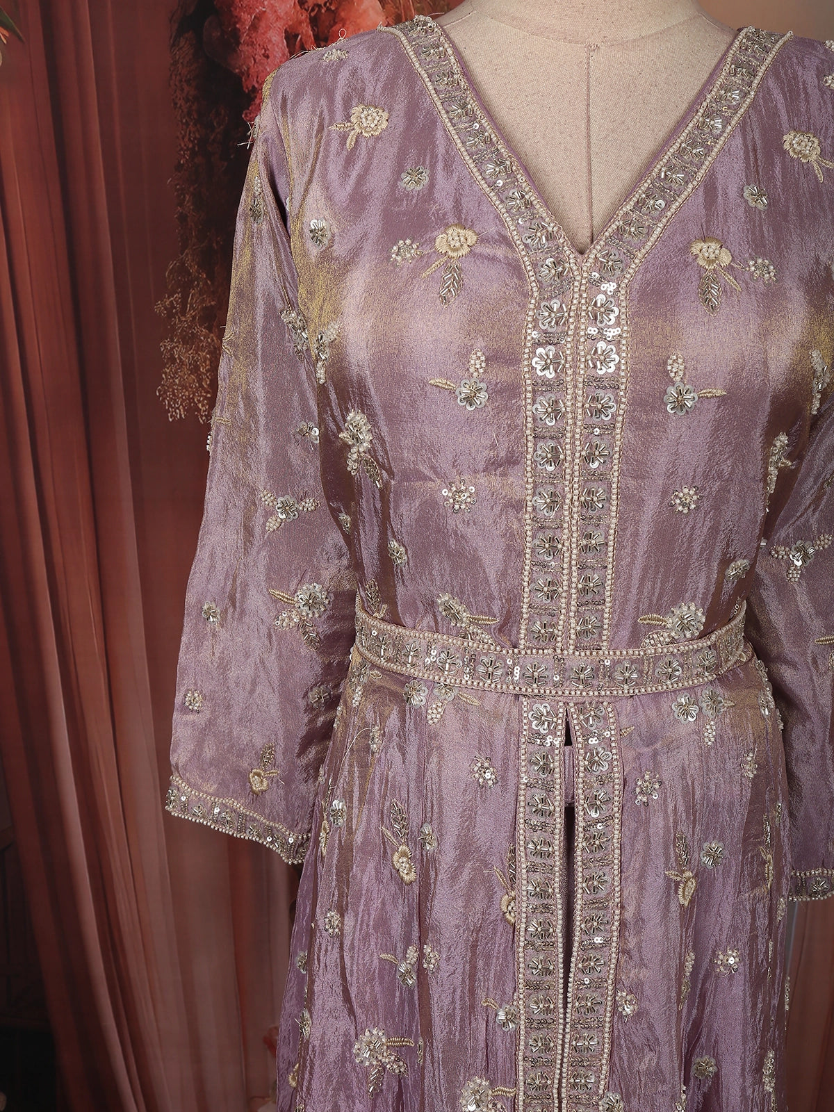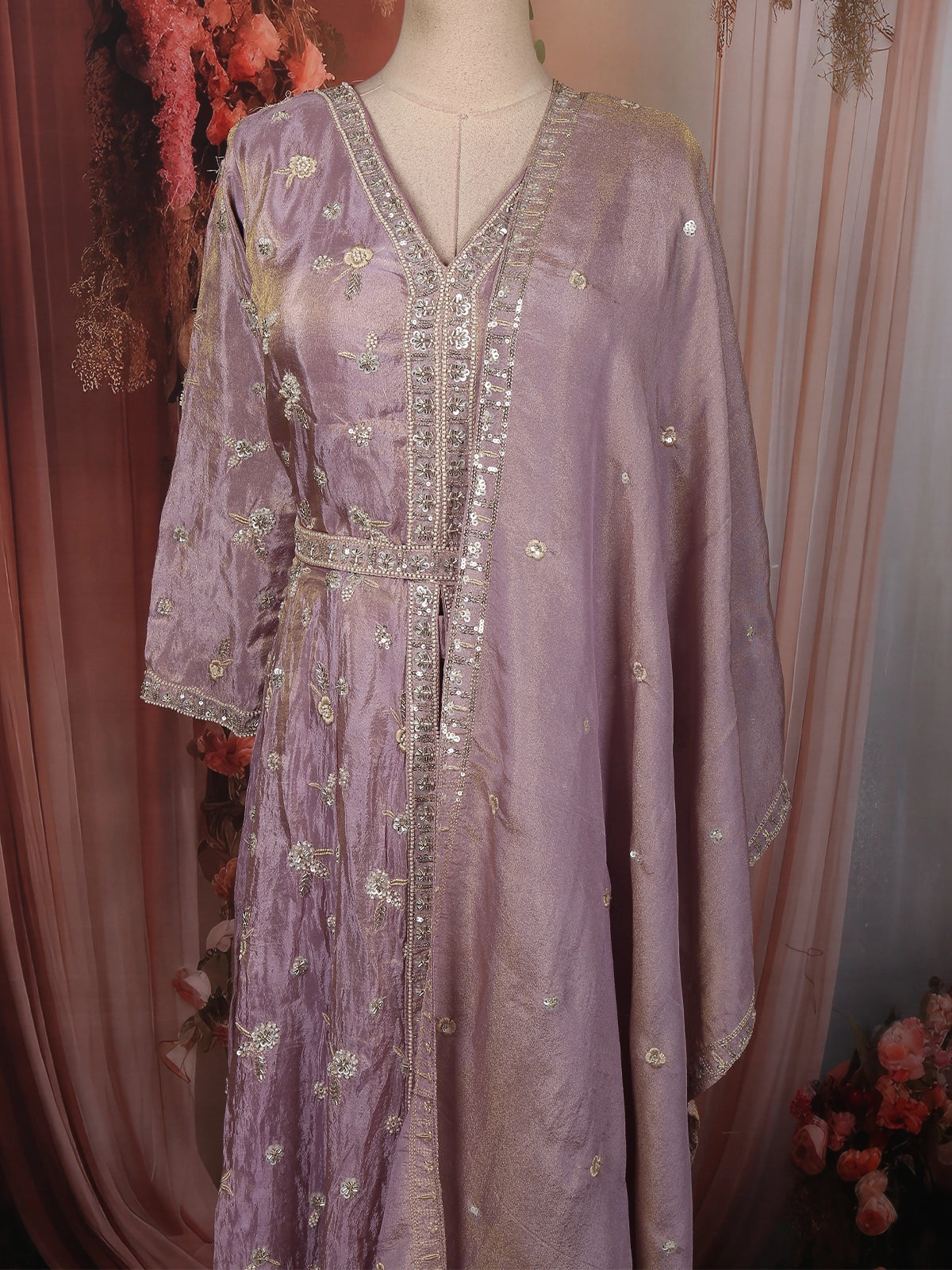 Crafted from premium tissue organza, the fabric carries a gentle sheen that beautifully catches the light, giving the outfit a luminous finish. The V-neckline is adorned with intricate floral sequins and beads embroidery, arranged in a vertical panel pattern that enhances the silhouette and adds depth to the design. The embellishments in ivory, soft gold, and champagne tones blend seamlessly with the blush base, offering a rich yet understated elegance.