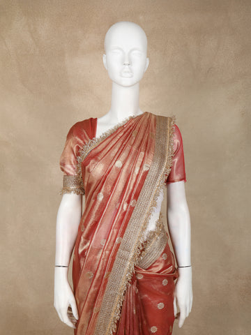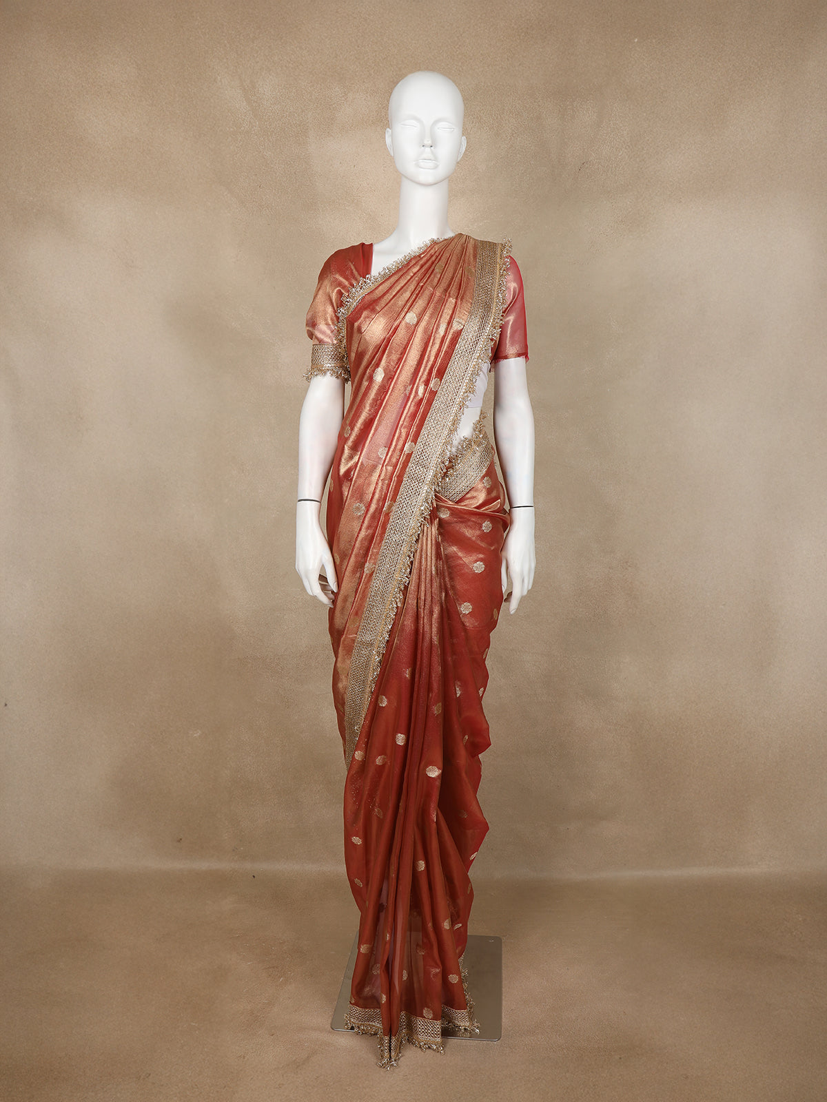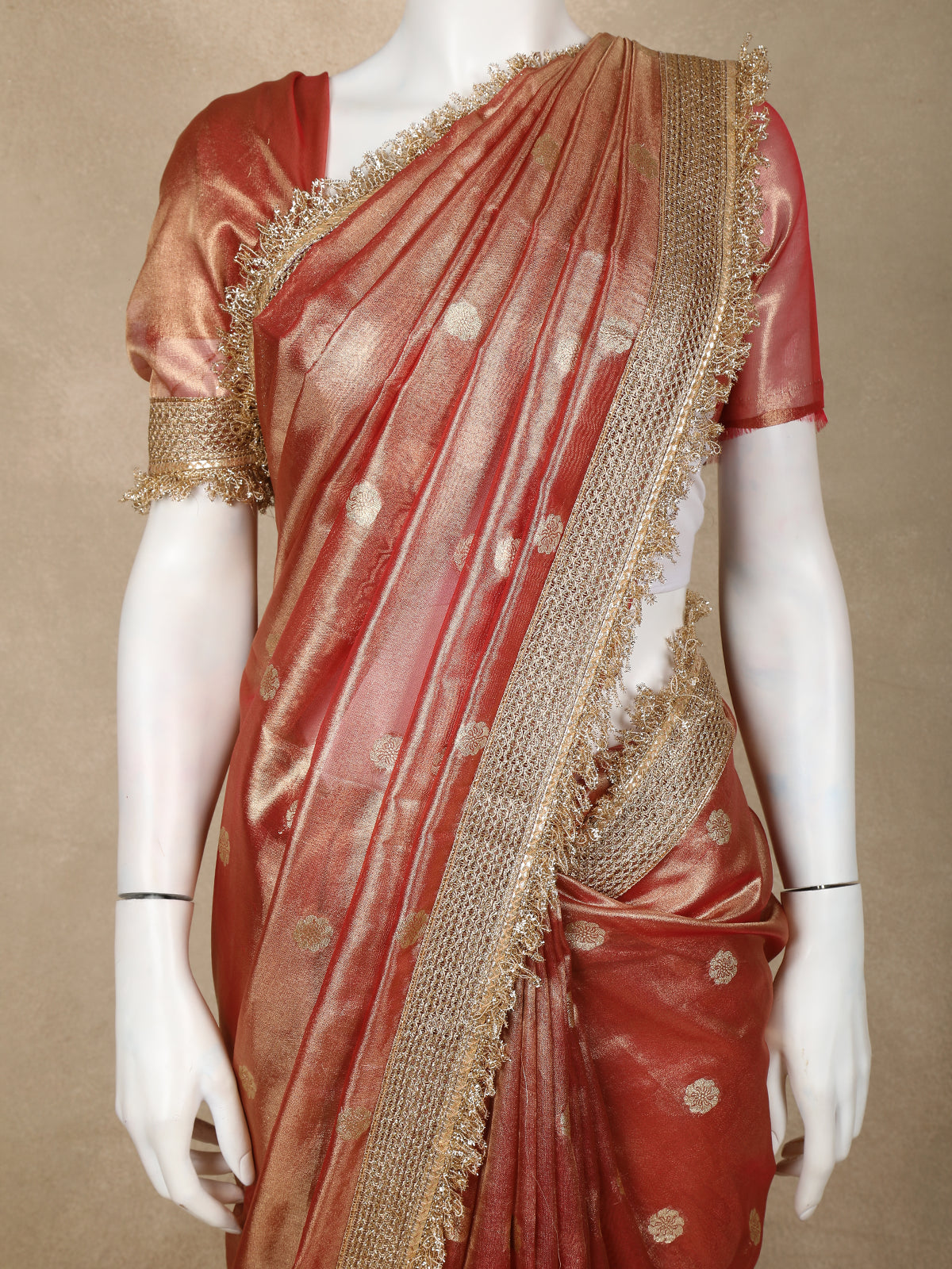 Drape yourself in shimmering luxury with this Orange Tissue Saree, gracefully adorned with delicate floral butta motifs that enhance its traditional charm. The fabric offers a glowing sheen, making it a stunning pick for weddings, receptions, and festive occasions.