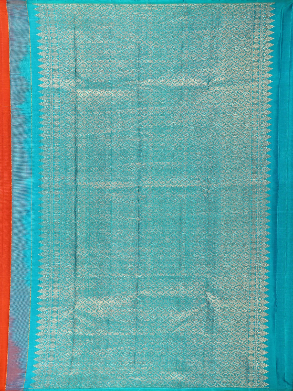 Indulge in the beauty of classic craftsmanship with this Light Orange Floral Design Kanchipuram Silk Saree. The saree features elegant floral woven motifs that add a touch of grace to the bright and joyful orange base, making it a perfect choice for festive and traditional occasions.