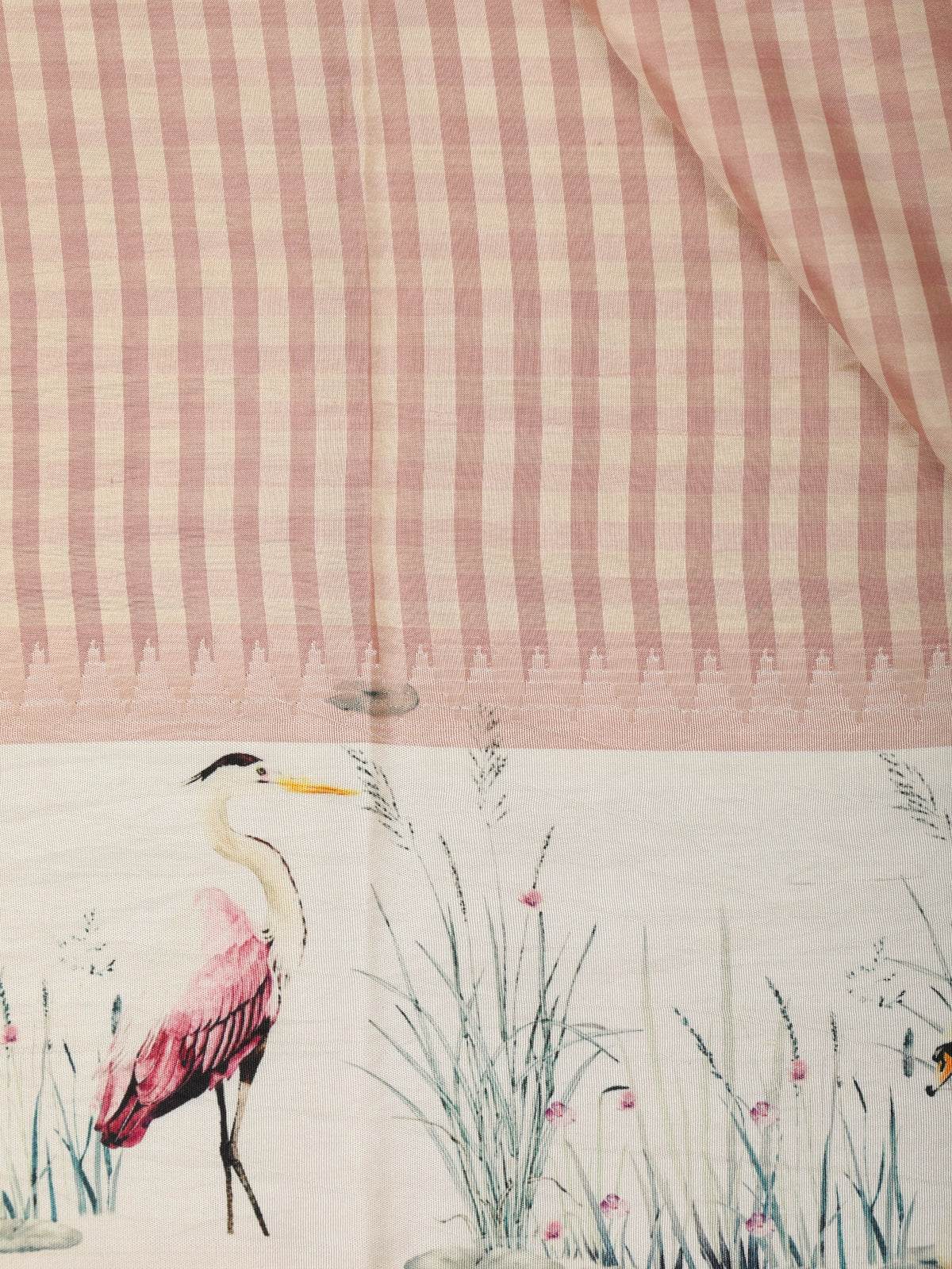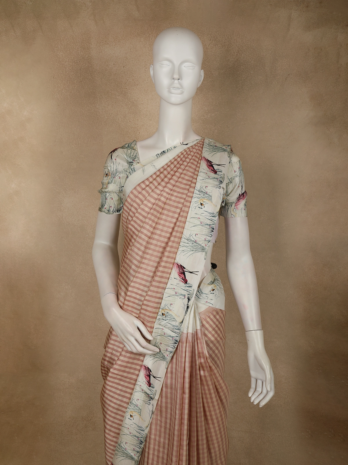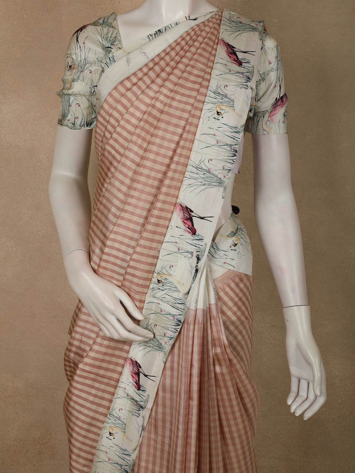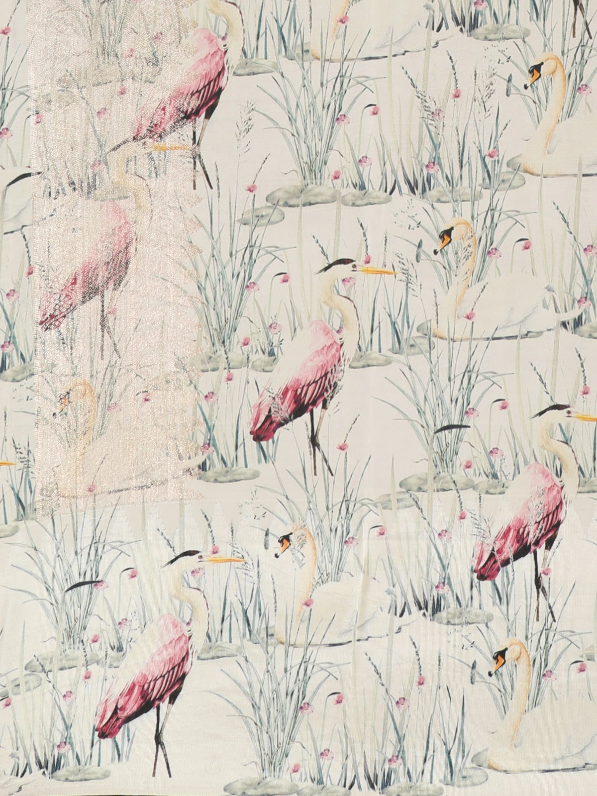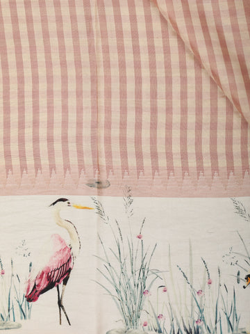 Adding a striking contrast, the saree is framed with a cream-toned printed border adorned with artistic floral and bird-inspired motifs in muted pastel shades. This thoughtfully designed border elevates the overall look, blending modern aesthetics with a touch of nature-inspired elegance. The pallu continues the printed theme, ensuring a harmonious and polished finish.