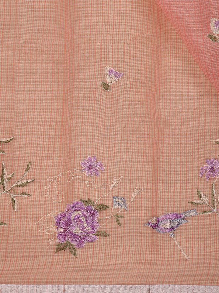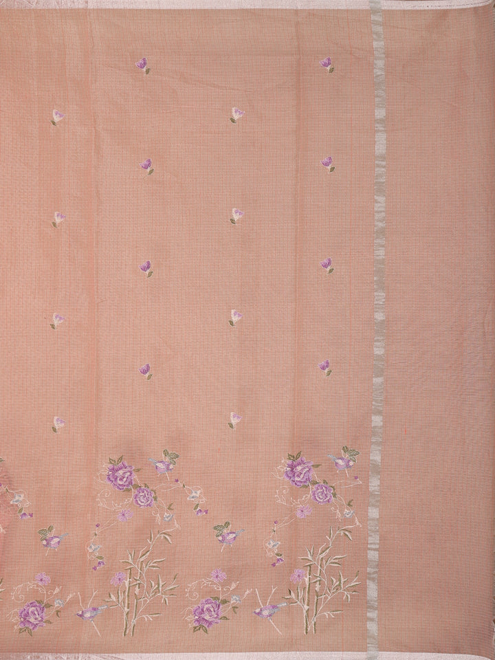 Grace your ethnic wardrobe with the soft allure of this Light Peach Floral Embroidered Kota Cotton Saree, a timeless blend of elegance and simplicity. Crafted from airy Kota cotton, this saree exudes effortless charm with delicate floral embroidery adorning its body, bringing a touch of artisanal finesse. The subtle zari border adds a gleam of tradition while maintaining understated sophistication.