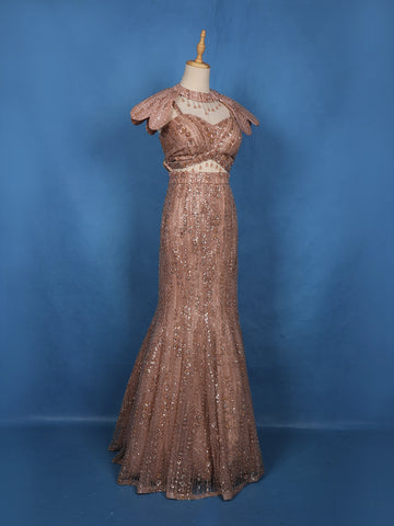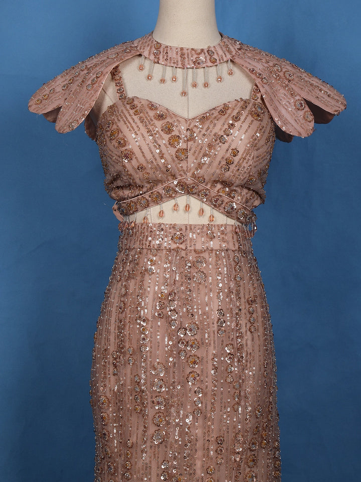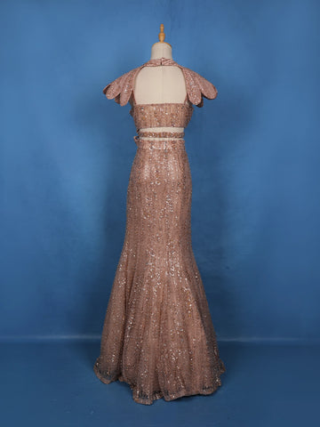 Grace meets glamour in this Light Peach Mermaid Gown, a luxurious creation designed to make every moment unforgettable. The gown features a sweetheart bodice with a delicate Sweetheart neckline, adorned with droplet beads and intricate floral sequin embroidery that shimmer in every light.