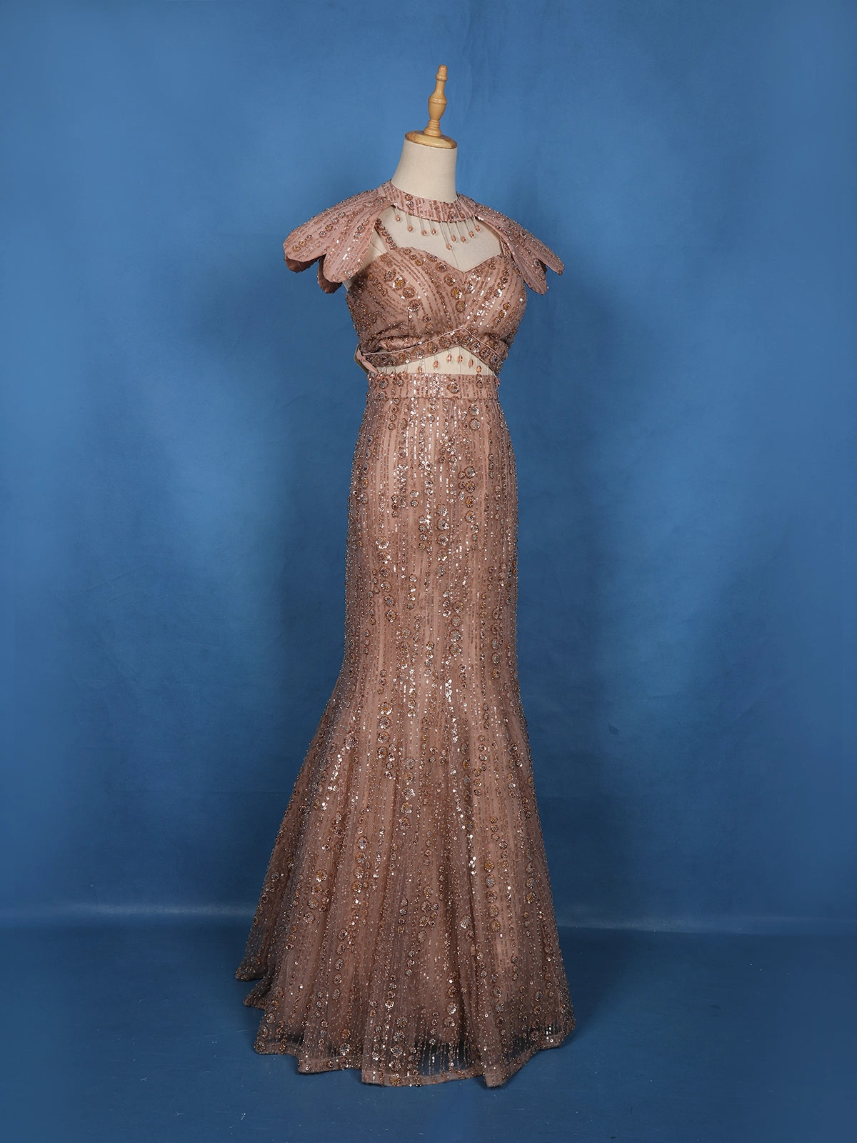 The structured shoulder flaps add a bold couture element, while the waist cut-out design introduces a modern, sensuous twist to the traditional silhouette. Crafted from fine net fabric, the ensemble flares beautifully into a mermaid-style hemline, giving an enchanting flow and sculpted fit.