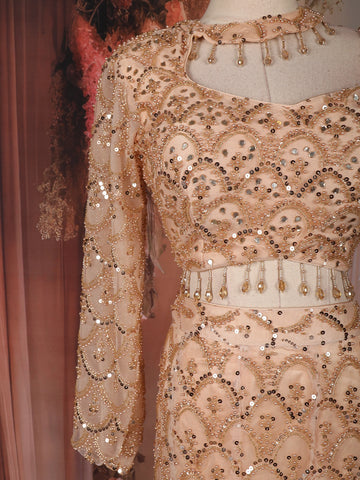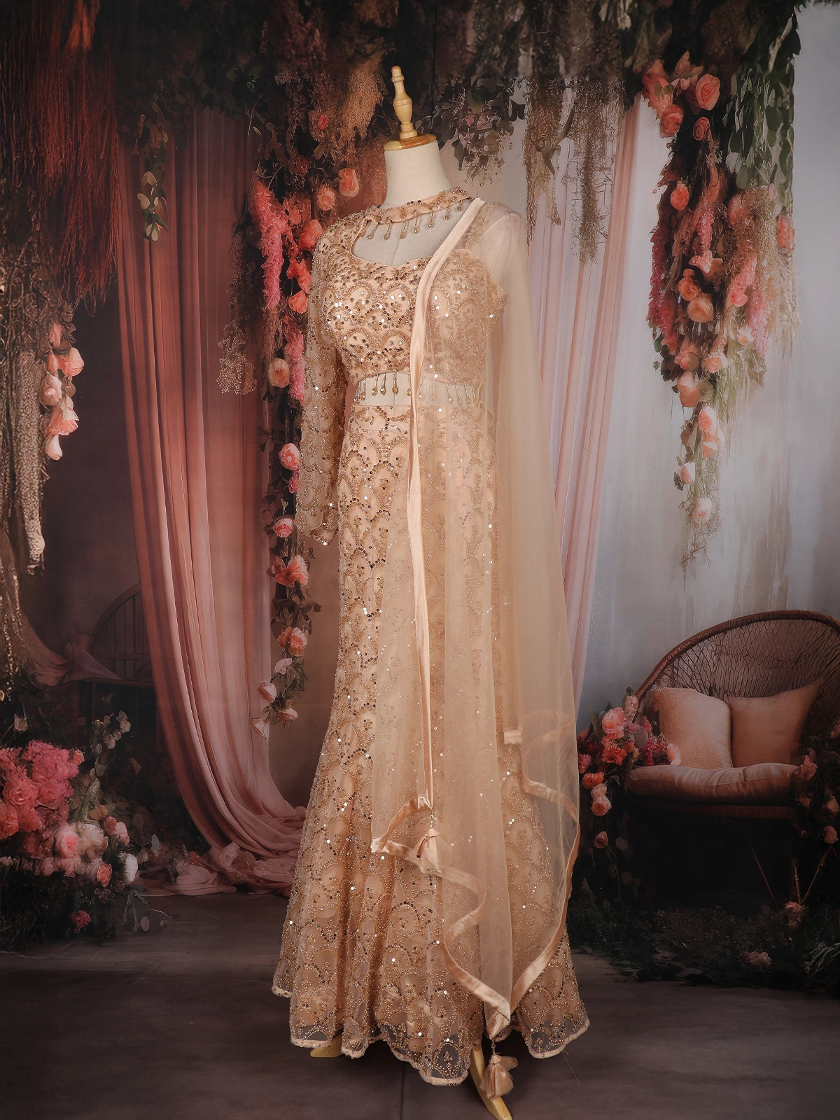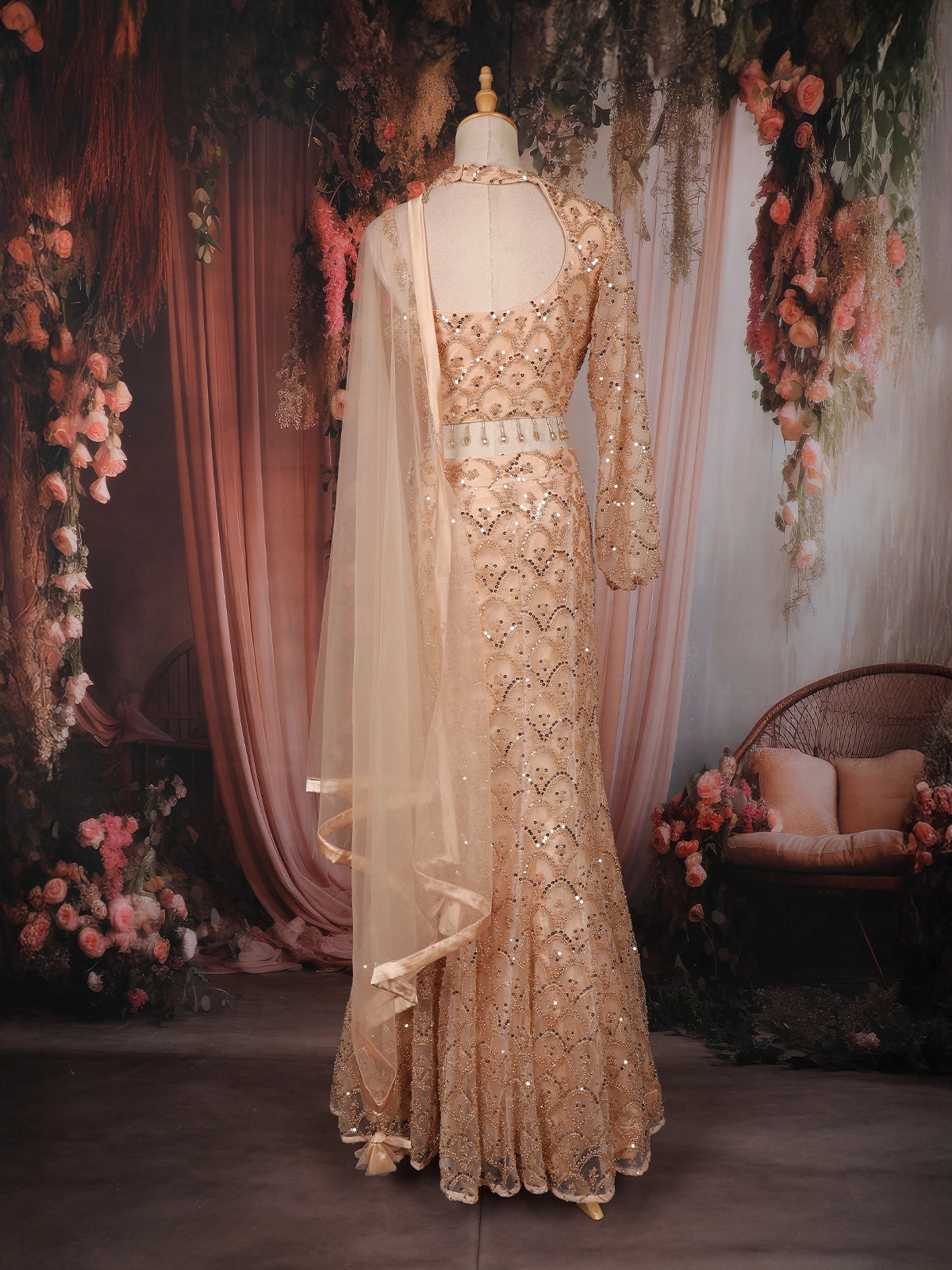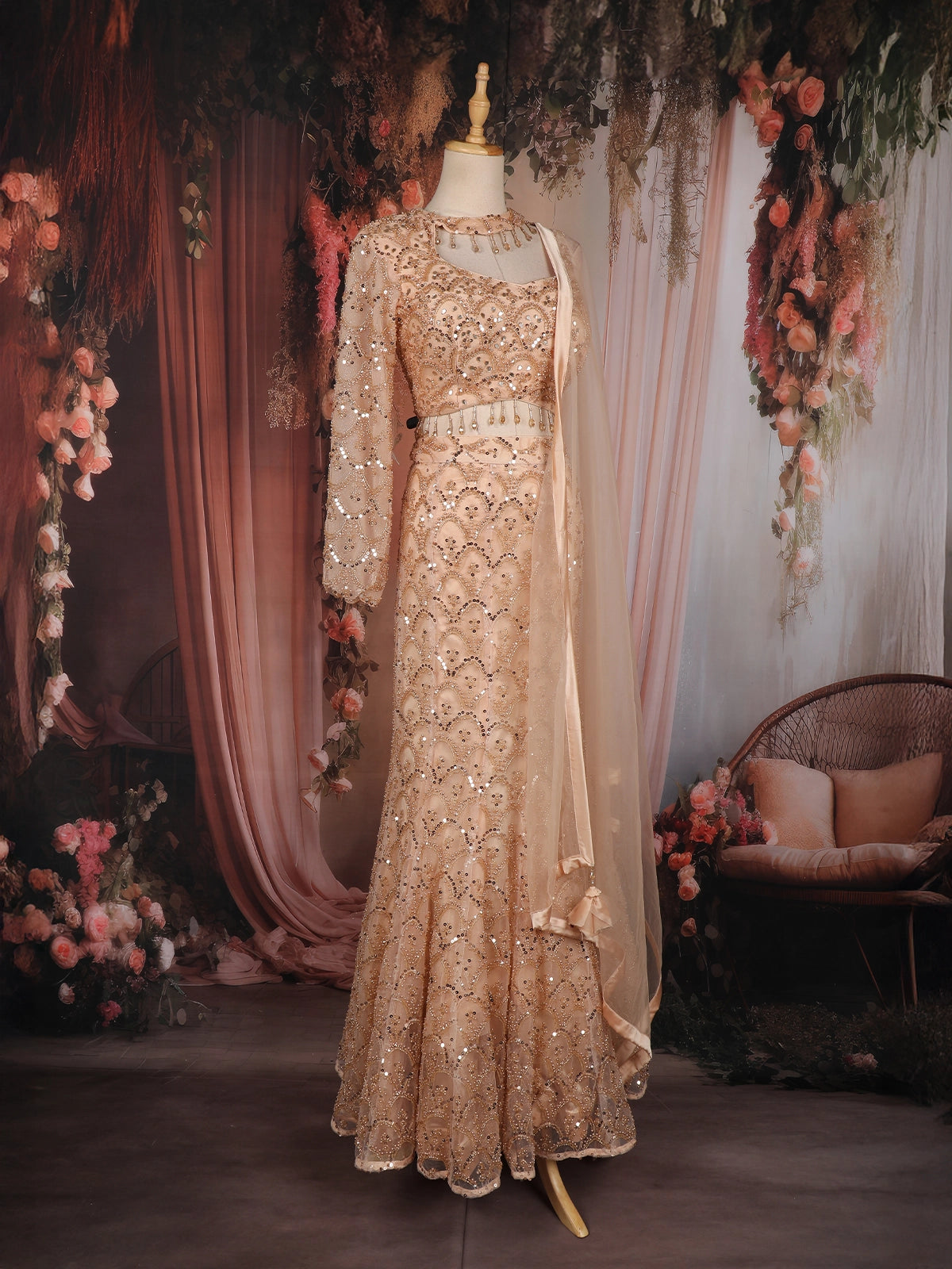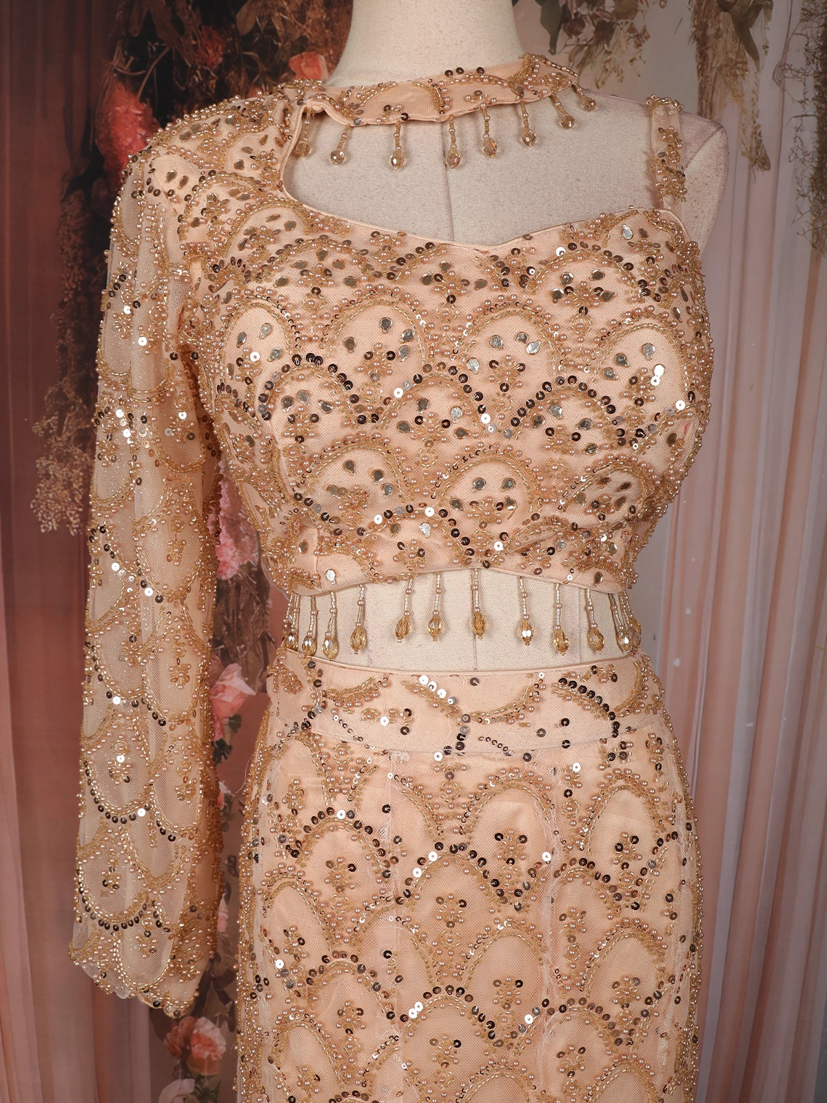 Light Peach Sequins Embroidered Net Mermaid Lehenga Set with One-Sleeve Choker Blouse
