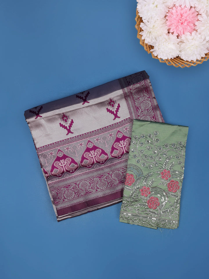 Light Pink And Magenta Ikat Design Art Silk Saree With Contrast Green Embroidered Blouse