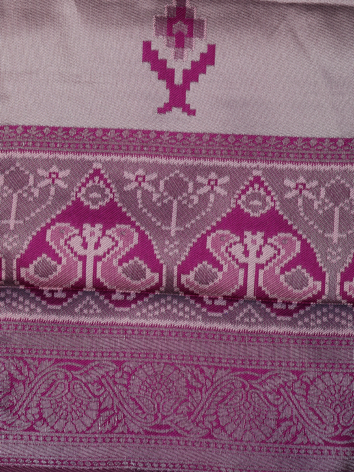Drape yourself in understated luxury with this Light Pink and Magenta Art Silk Saree, beautifully woven with Ikat-inspired motifs that celebrate traditional craftsmanship. The soft pink body is accented with magenta woven patterns, lending a perfect blend of subtlety and vibrance. A rich zari border and a contrast pink pallu add regal depth and finesse to the overall design.