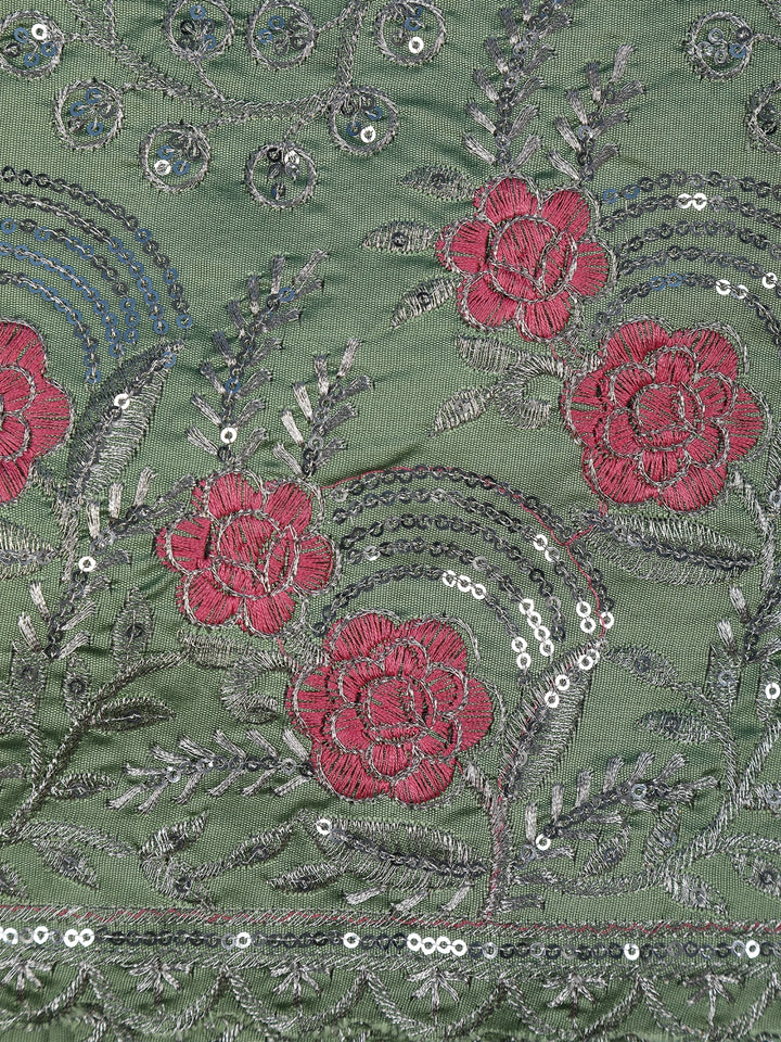 The saree is complemented by a contrast green blouse, exquisitely embroidered with floral sequin and thread work in rose and silver tones, giving the ensemble a modern festive edge. Perfect for weddings, receptions, or festive celebrations, this saree strikes the right balance between classic elegance and contemporary glamour.