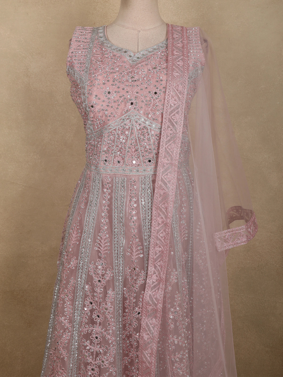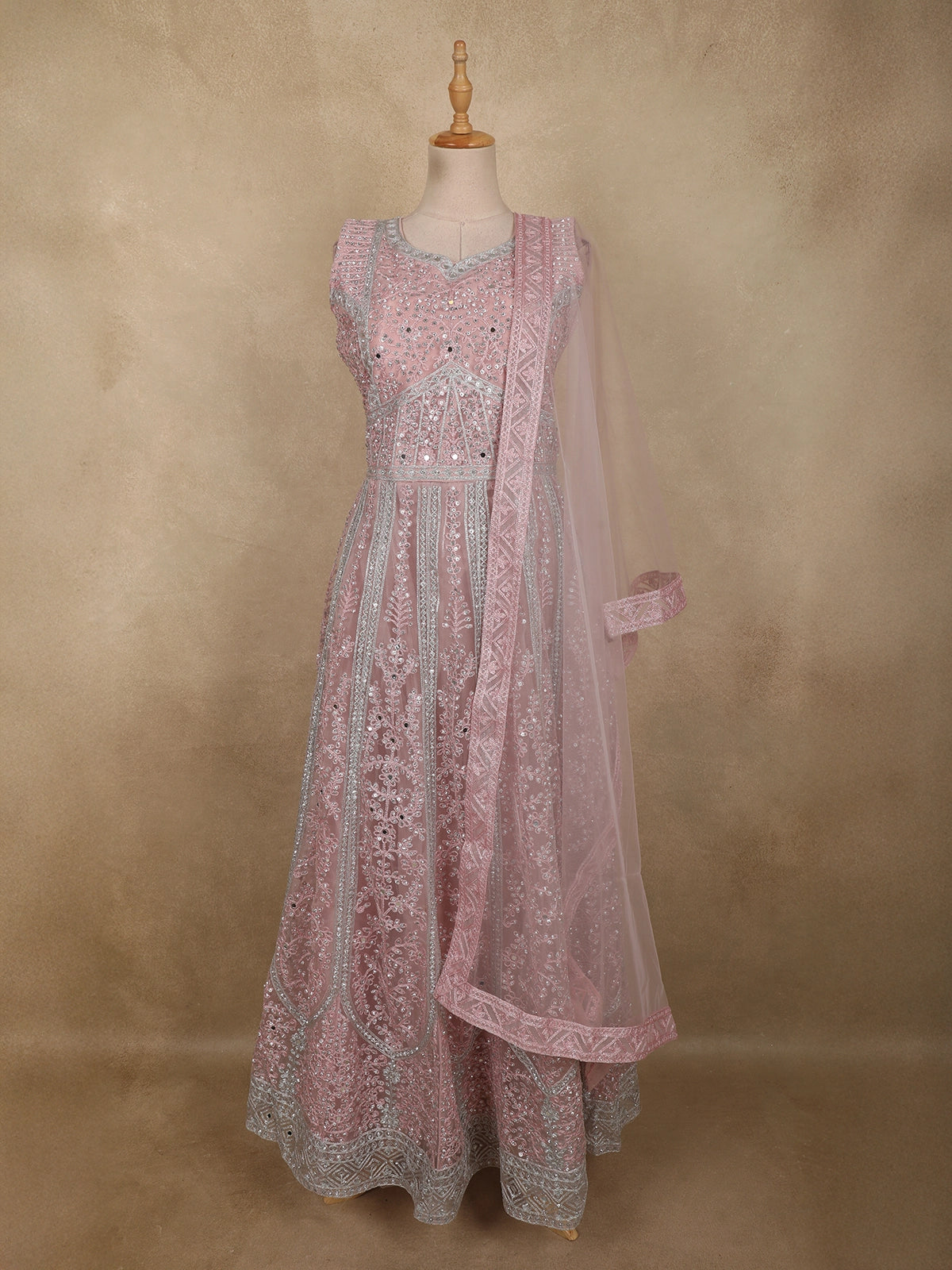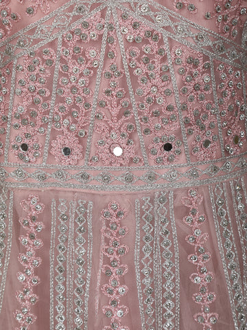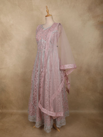 Light Pink Floral Thread and Mirror Embroidered Design Net Gown with Dupatta