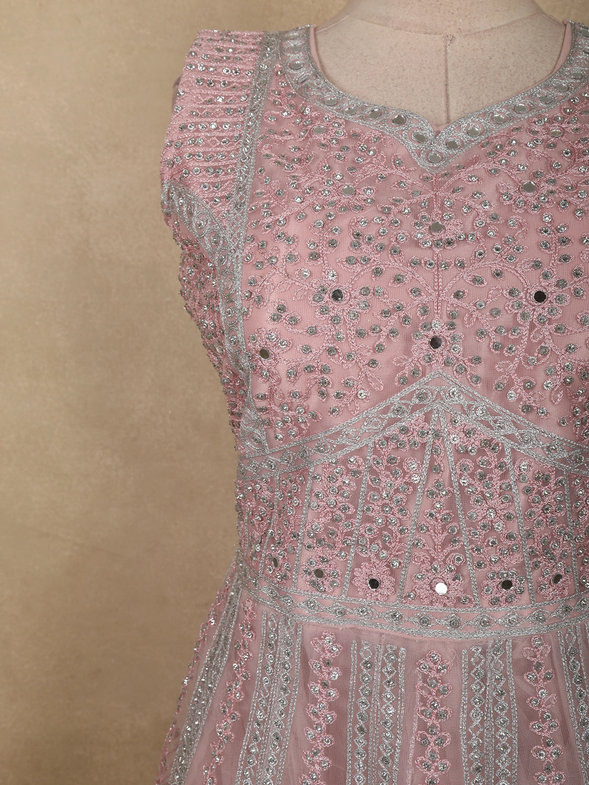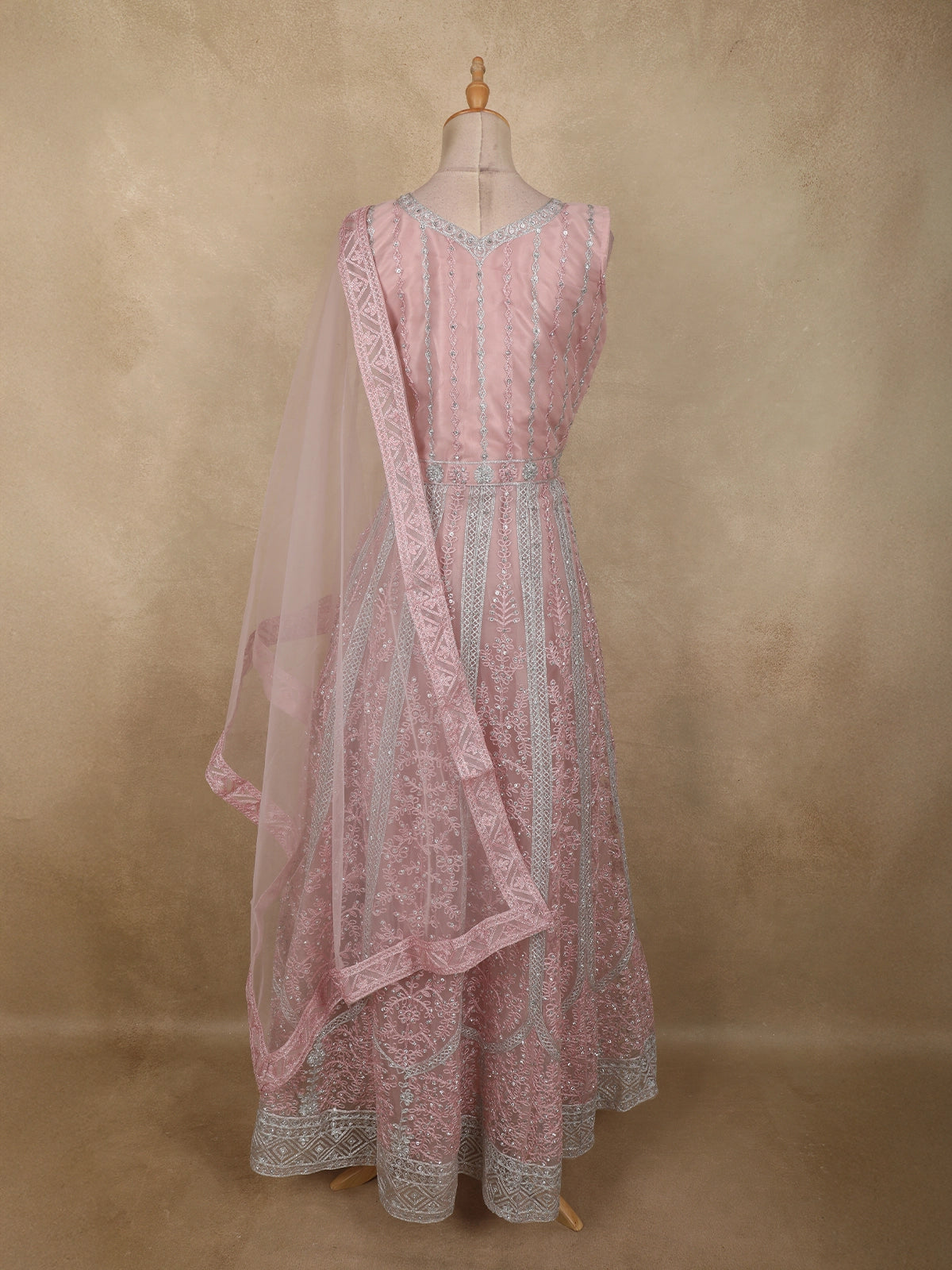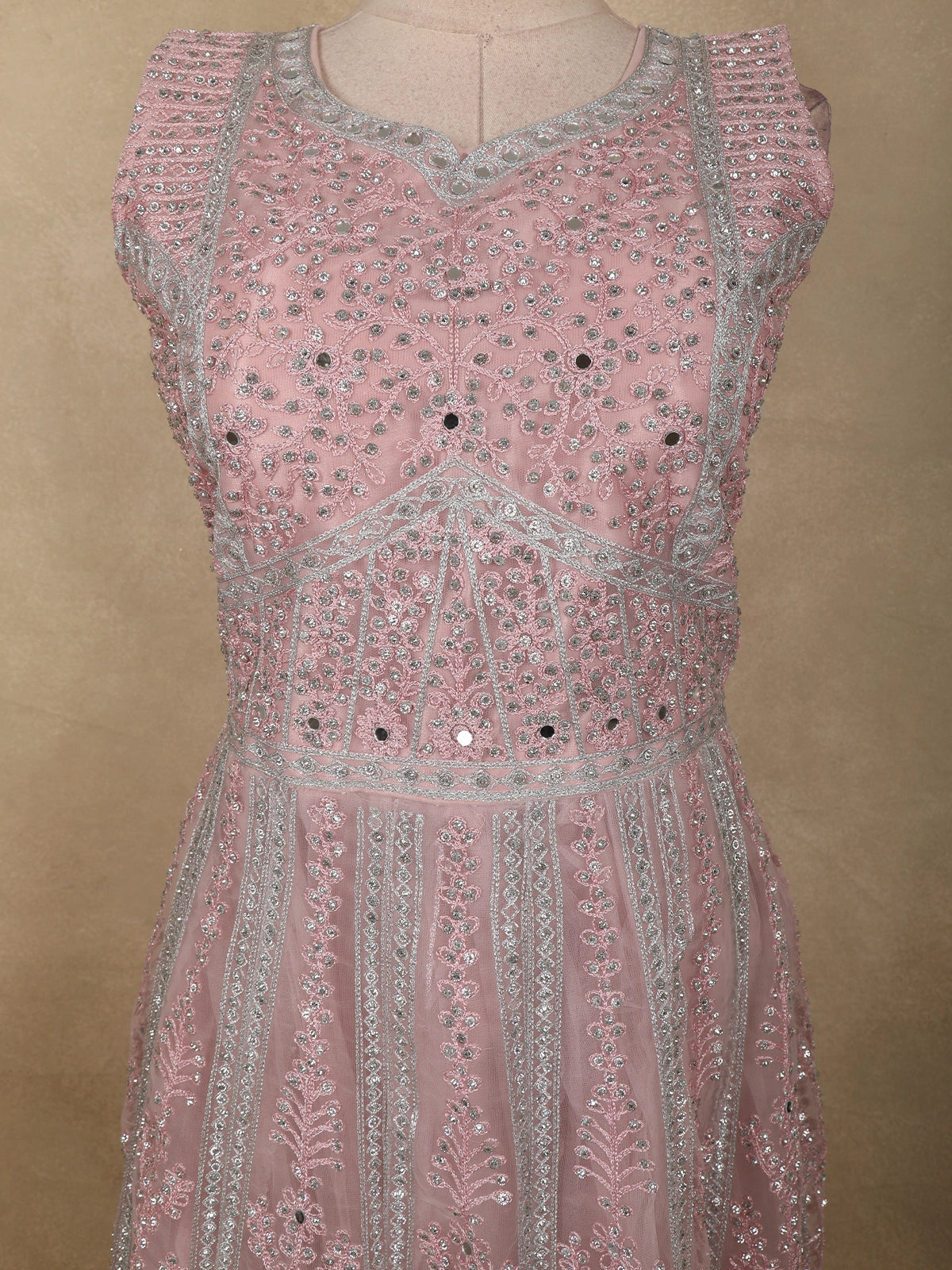Light Pink Floral Thread and Mirror Embroidered Design Net Gown with Dupatta