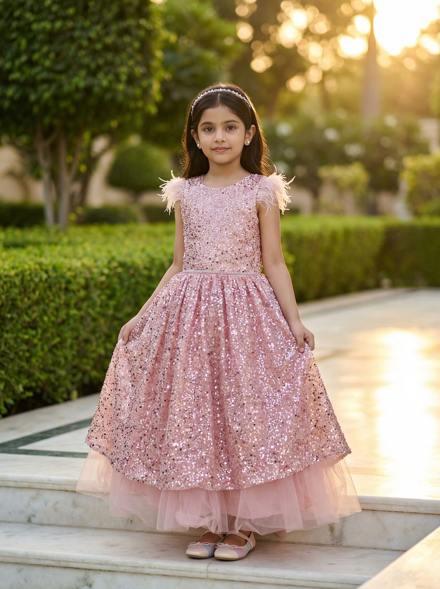Elevate your party look with this ethereal light pink net gown, adorned with exquisite sequin embellishments that shimmer with every movement. The feather sleeves add a touch of whimsy and glamour, enhancing the gown's allure. Designed with a round neckline and a flattering silhouette, it exudes grace and elegance, perfect for special occasions. The floral design adds a romantic charm, while the delicate sequins create a mesmerizing effect. Ensure its pristine condition with dry cleaning, preserving its enchanting beauty for unforgettable moments. Flaunt your style with confidence in this enchanting gown, destined to captivate hearts wherever you go.