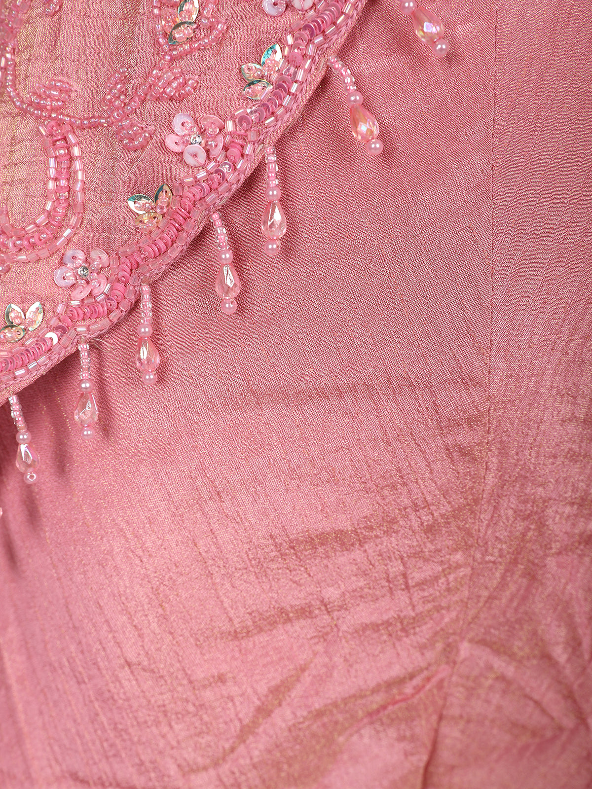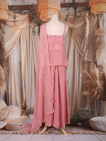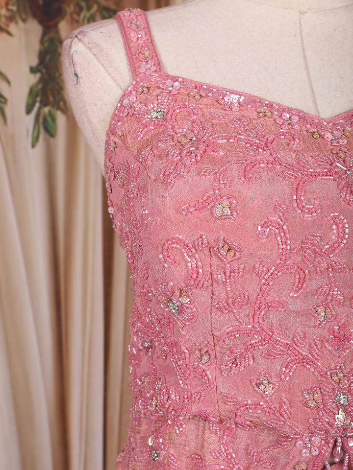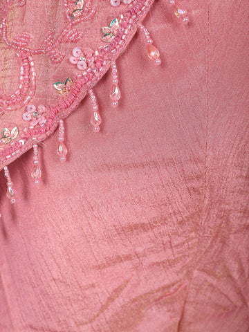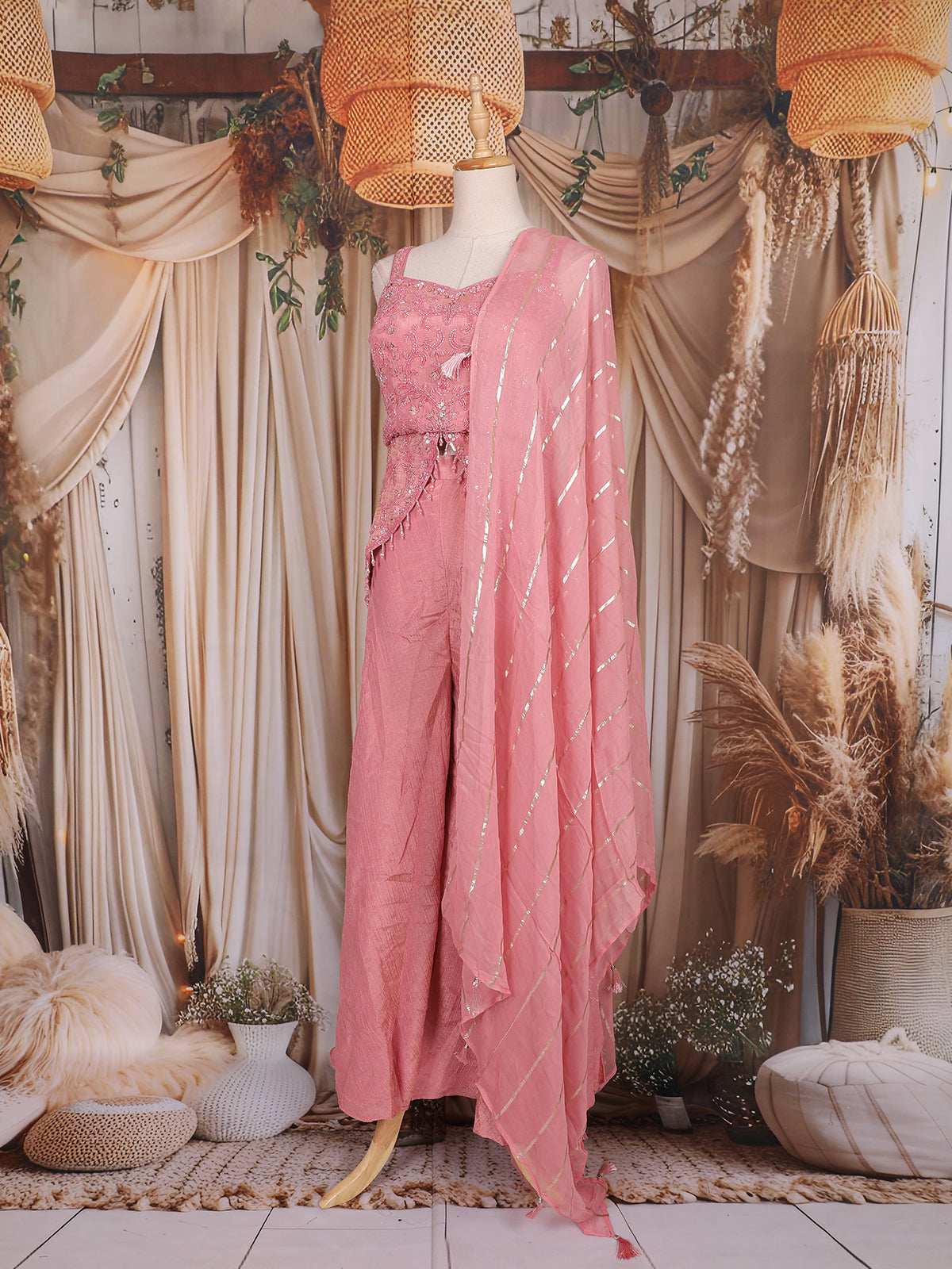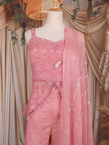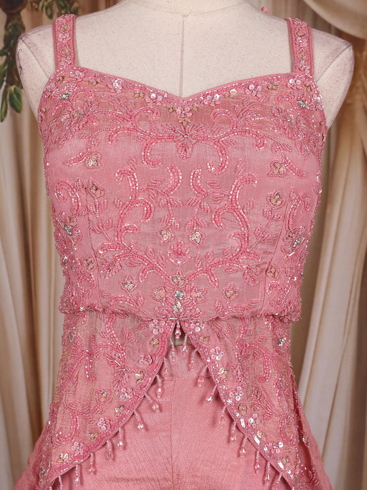 Step into timeless elegance with this Pink Peplum Palazzo Suit, a masterpiece of refined craftsmanship and feminine grace. The sleeveless peplum-style kurta is beautifully adorned with intricate sequin, bead, and thread embroidery, creating a delicate vine and floral pattern across the bodice and hem. The sweetheart neckline accentuates the neckline elegantly, while the subtle slit at the front hem adds a modern peplum flair with dainty bead tassels for a graceful finish.