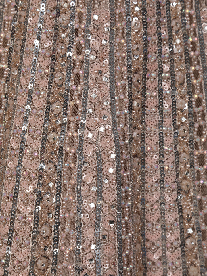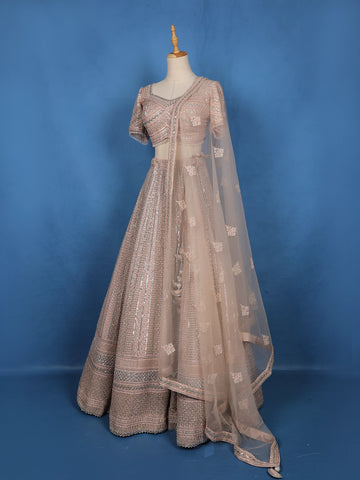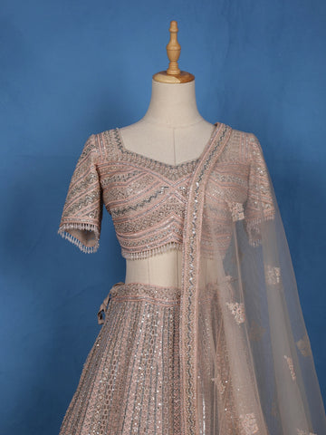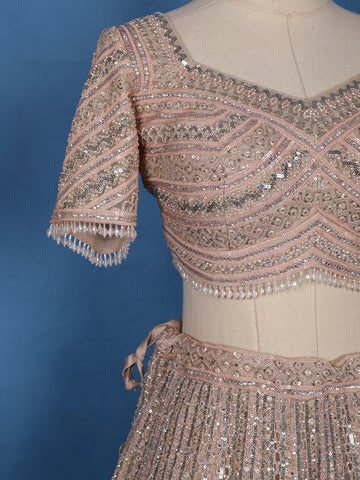 Radiate ethereal charm in this Light Pink Sequins Embroidery Net Lehenga, a perfect blend of grace and glamour. Crafted from soft net fabric, the ensemble features an intricately embroidered V-neck blouse adorned with shimmering sequins and beadwork arranged in elegant geometric patterns. The half sleeves are delicately embellished to complement the rich craftsmanship of the blouse.