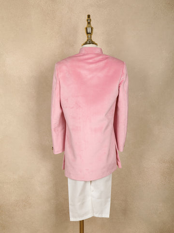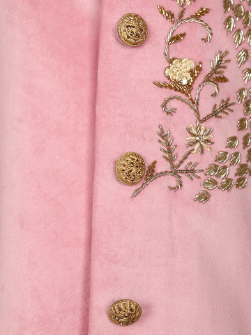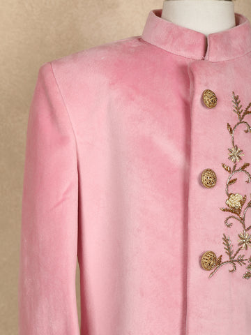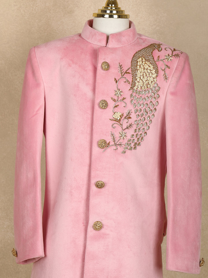 Light Pink Velvet Peacock Design Bead Work Sherwani and Pant Set