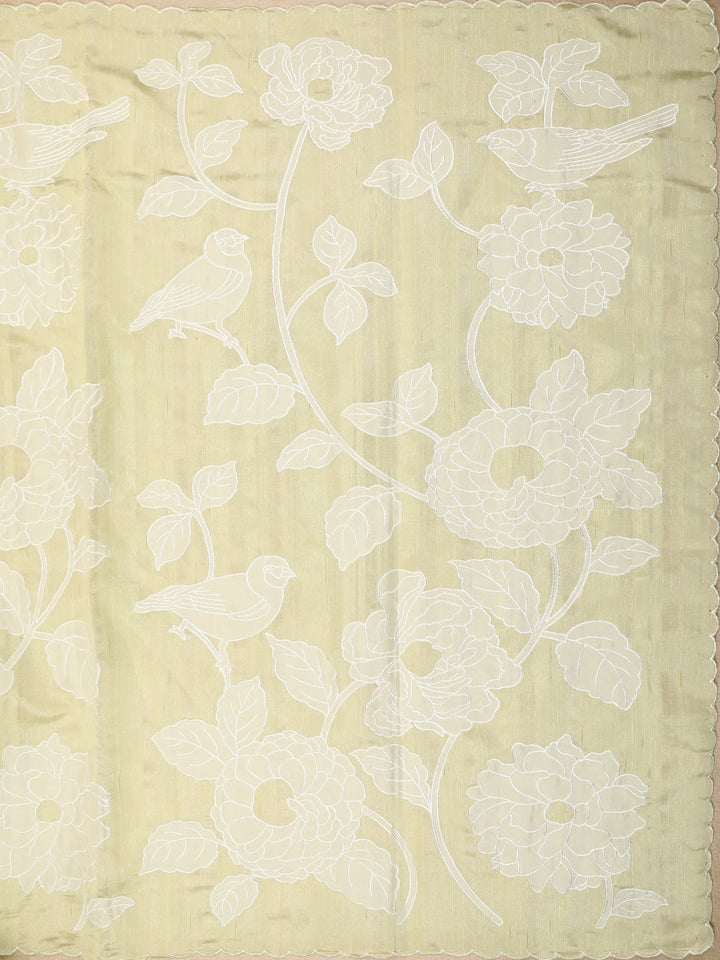 The saree features intricately placed applique floral motifs, adding depth, texture, and exquisite detailing that enhances its natural charm. The delicate design work complements the subtle pastel tone, creating an effortlessly sophisticated look ideal for women who adore subtle glamour with handcrafted beauty.