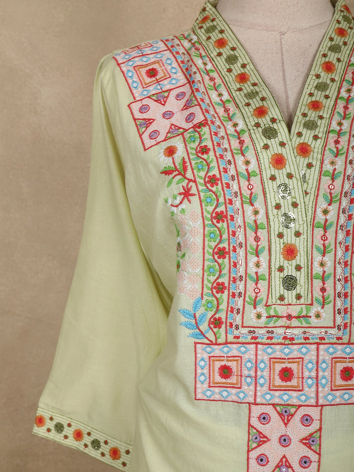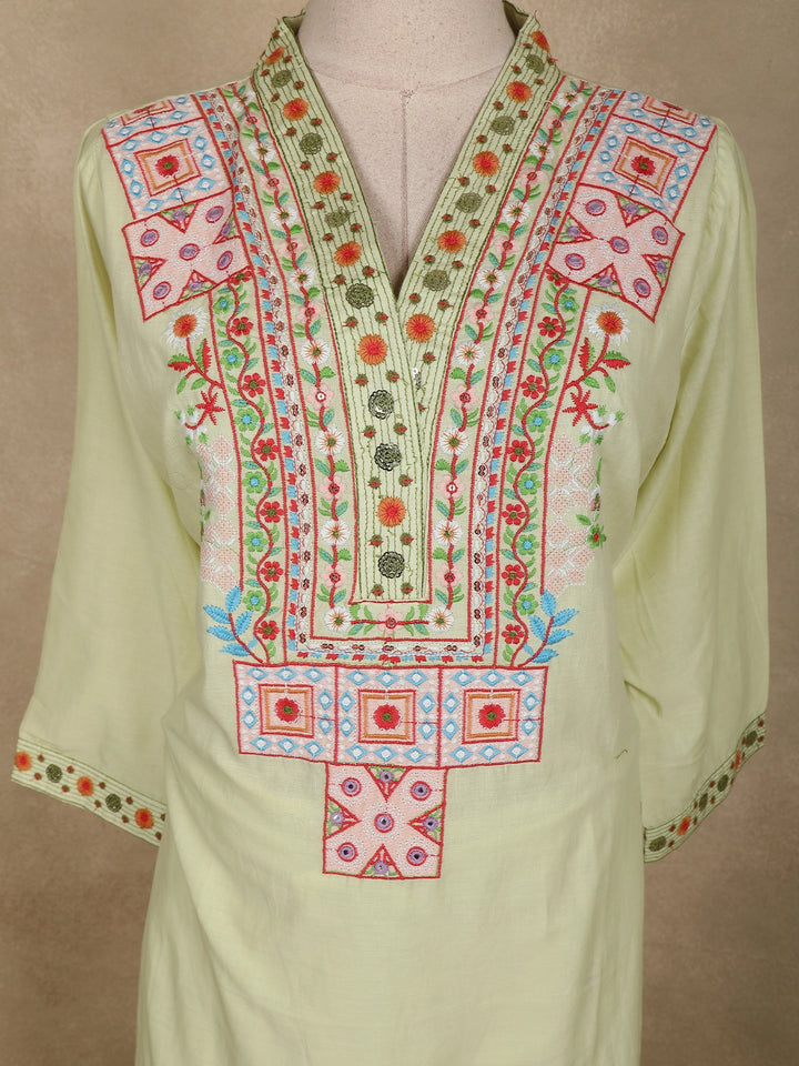 Elevate your everyday elegance with this soothing pistachio green cotton salwar suit featuring intricate multicolor thread embroidery. The beautifully crafted yoke highlights floral and geometric motifs, adding a vibrant ethnic charm to the ensemble. The straight-cut kurta paired with a matching bottom and a soft dupatta creates a graceful and comfortable outfit ideal for casual gatherings and daytime outings.
