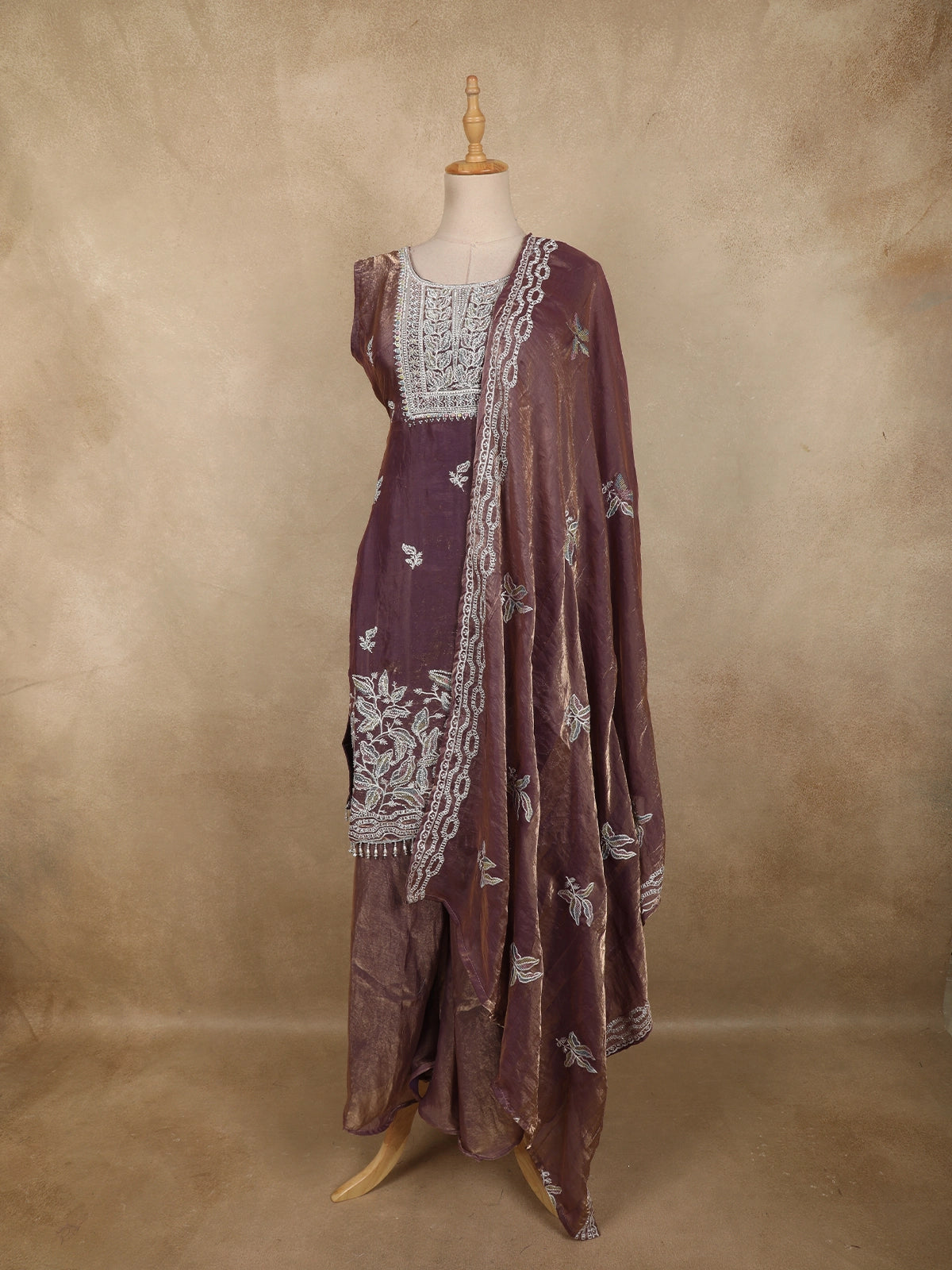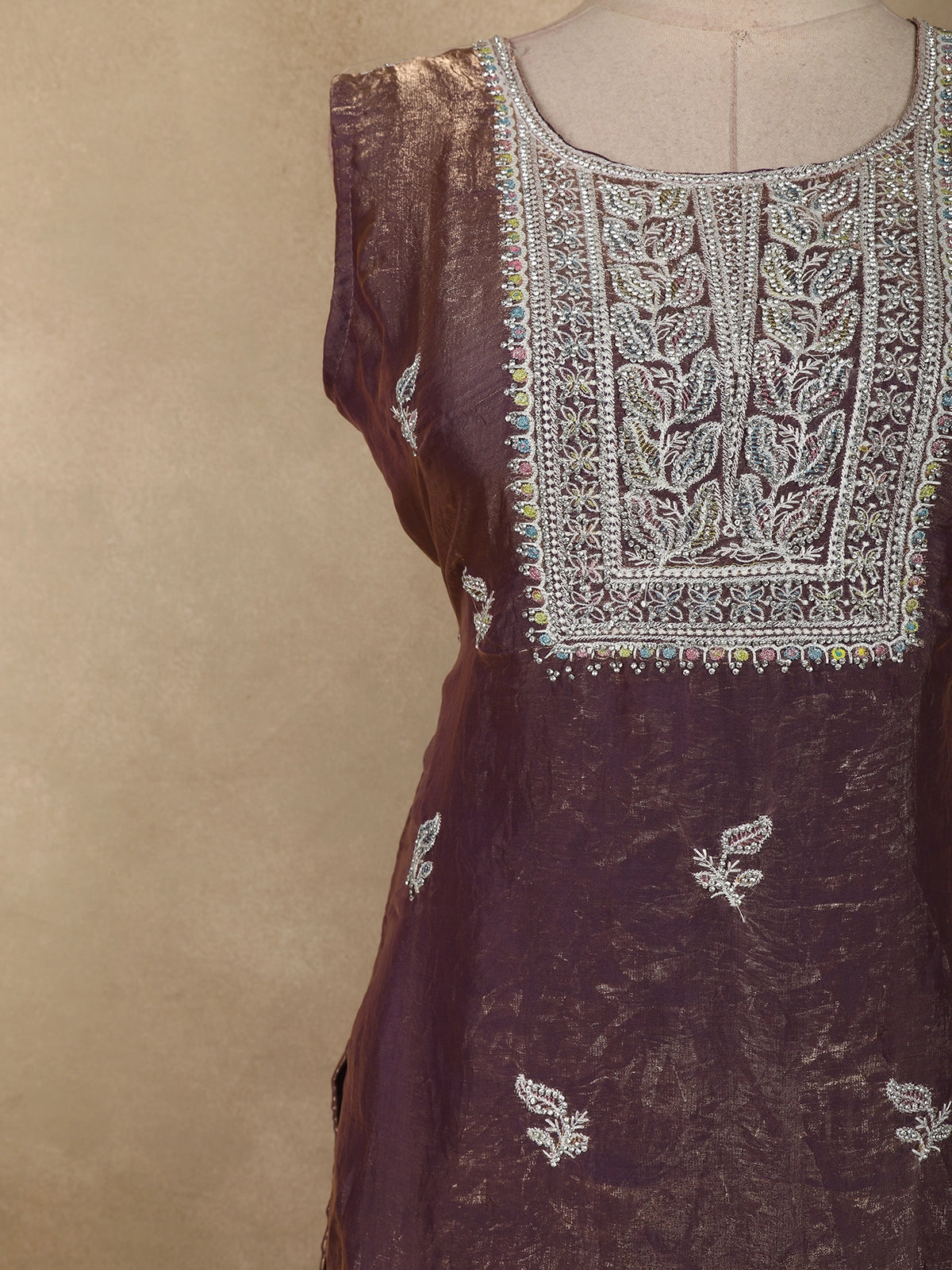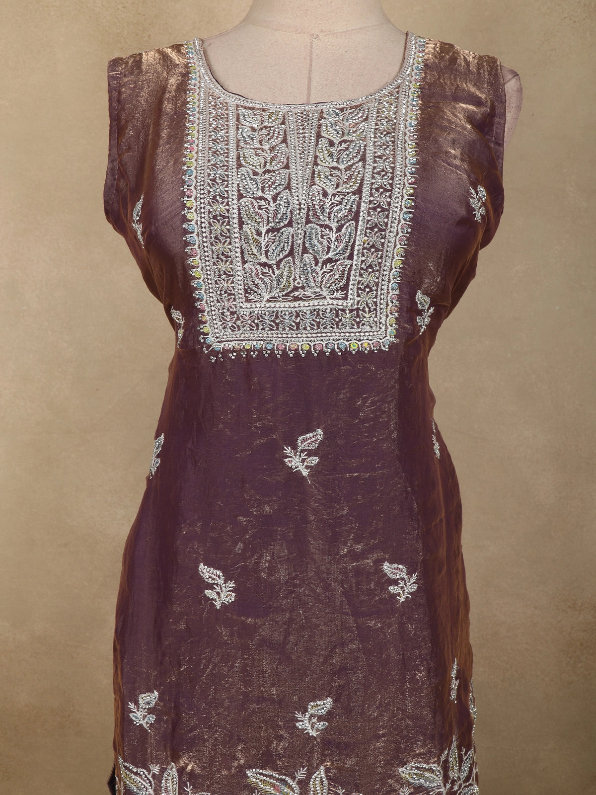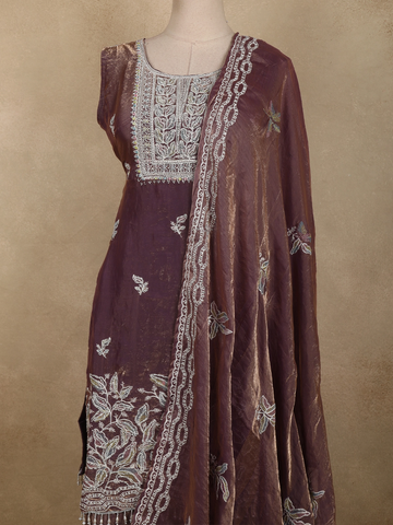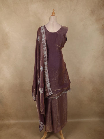 Add a touch of feminine elegance to your festive wardrobe with this Purple organza palazzo suit, designed to reflect soft glamour and refined craftsmanship. The kurta showcases delicate floral embroidery highlighted with shimmering sequins and intricate beadwork, creating a graceful sparkle that enhances the overall look. The embroidery is beautifully placed along the neckline, hem, and scattered across the body for a balanced, elegant finish.