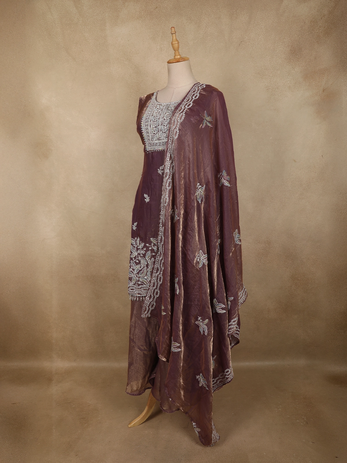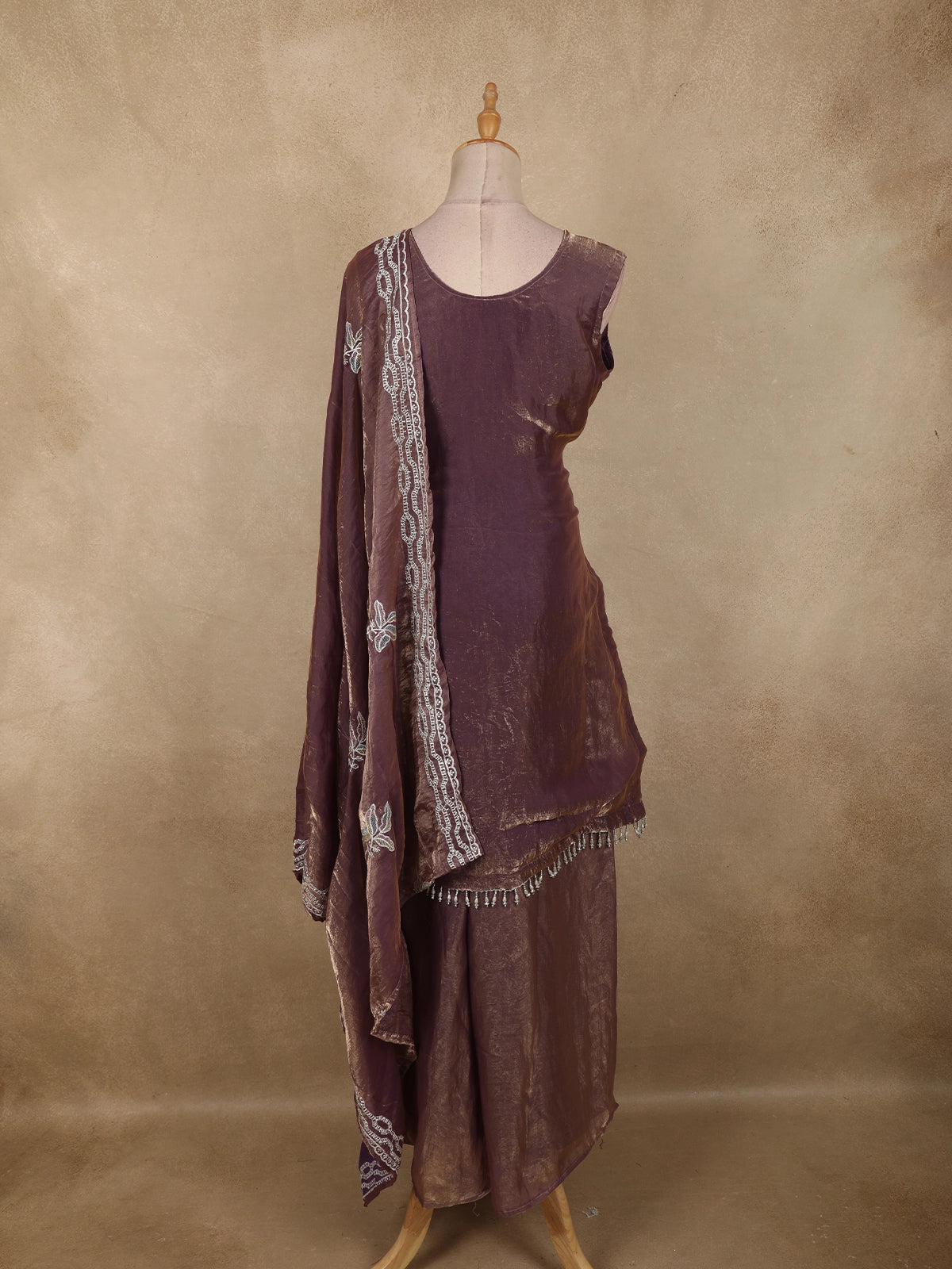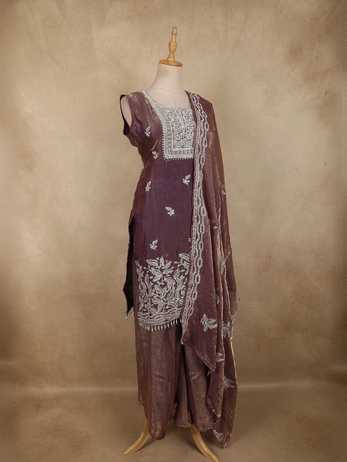 Add a touch of feminine elegance to your festive wardrobe with this Purple organza palazzo suit, designed to reflect soft glamour and refined craftsmanship. The kurta showcases delicate floral embroidery highlighted with shimmering sequins and intricate beadwork, creating a graceful sparkle that enhances the overall look. The embroidery is beautifully placed along the neckline, hem, and scattered across the body for a balanced, elegant finish.
