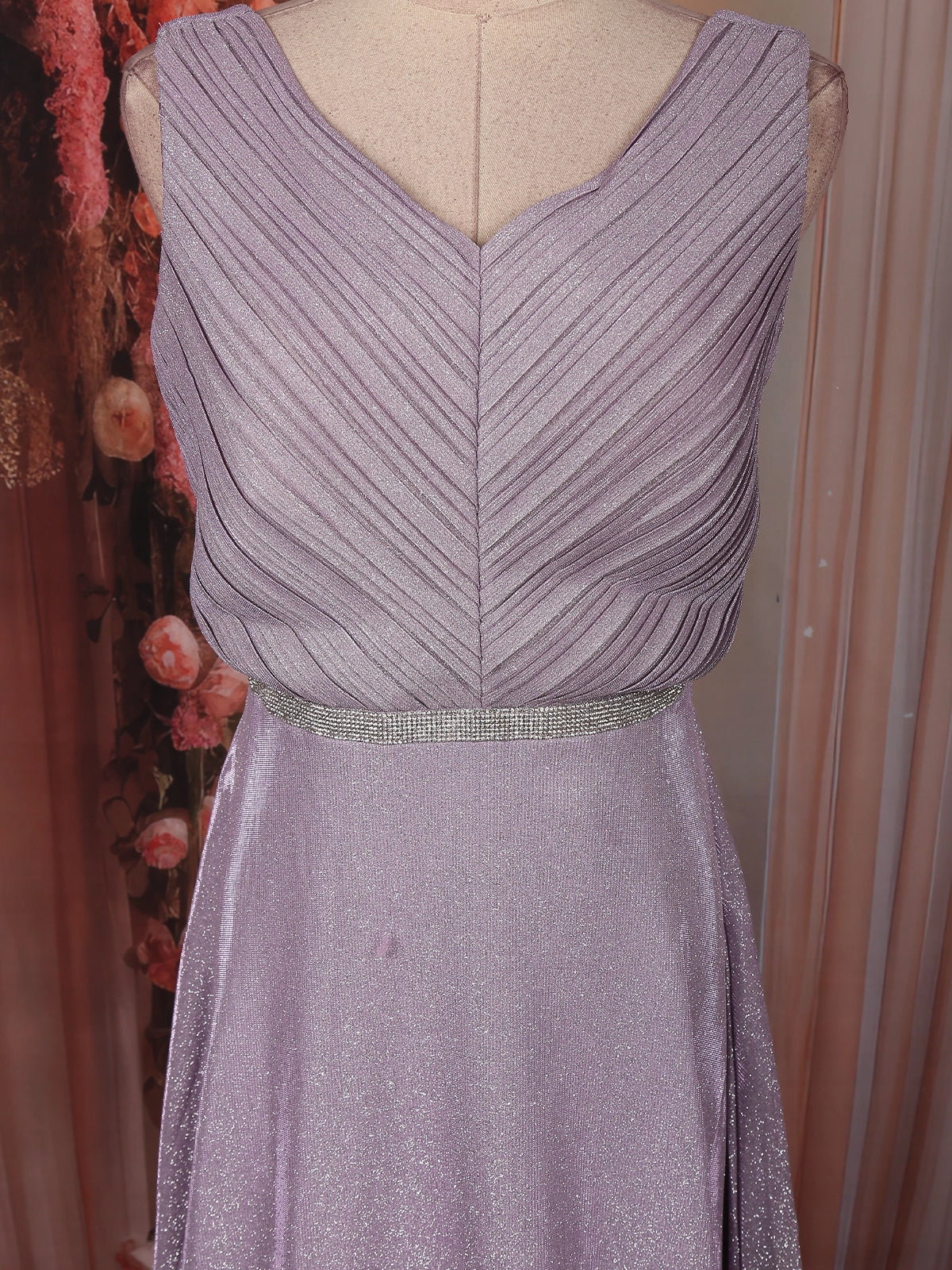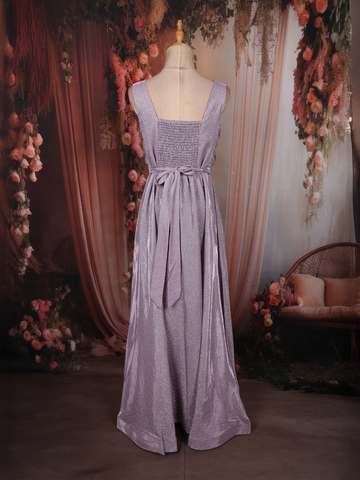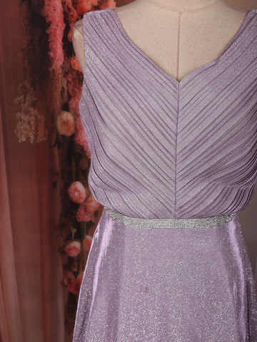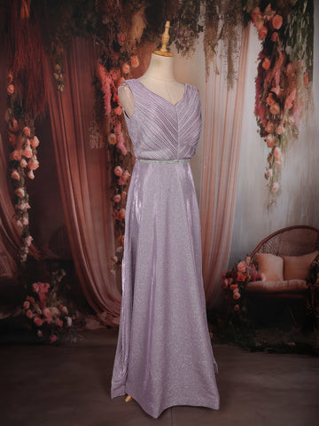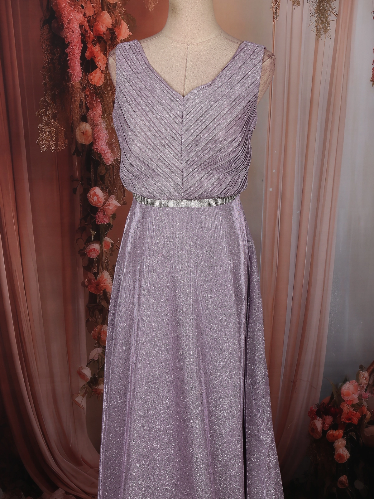 Crafted in a soft, flowy shimmer fabric, the gown features delicate micro-glitter detailing that gently catches the light, adding a refined sparkle without overpowering the look. The sleeveless silhouette is enhanced with a flattering V-neckline, giving it a modern yet classic appeal. Soft gathers along the bodice add texture and dimension, while the neatly pleated waistband accentuates the waistline, creating a beautifully structured and feminine shape.