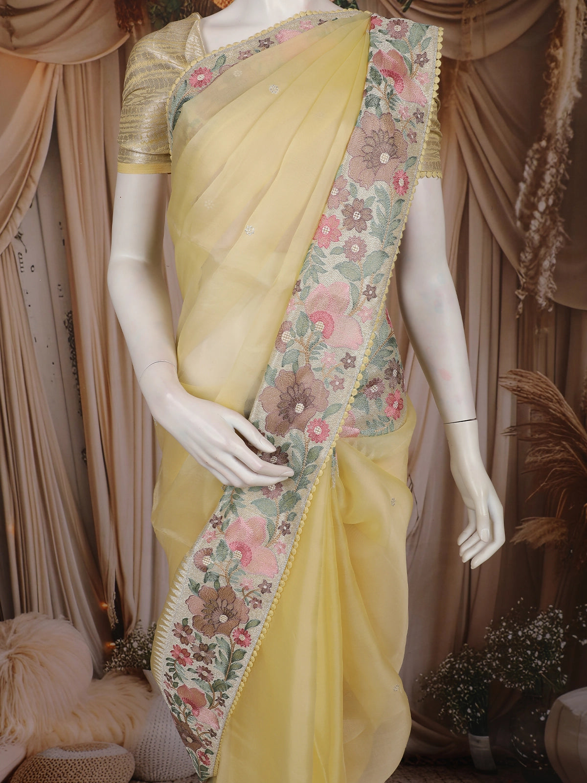 Step into effortless elegance with this pastel light yellow organza saree featuring a beautifully embroidered floral border in shades of pink, brown, and sage green. The soft translucency of the organza drape adds a dreamy charm, while tiny scattered sequin buttis enhance the saree with a gentle shimmer. Graceful and lightweight, it falls beautifully and creates a flattering silhouette for any occasion.