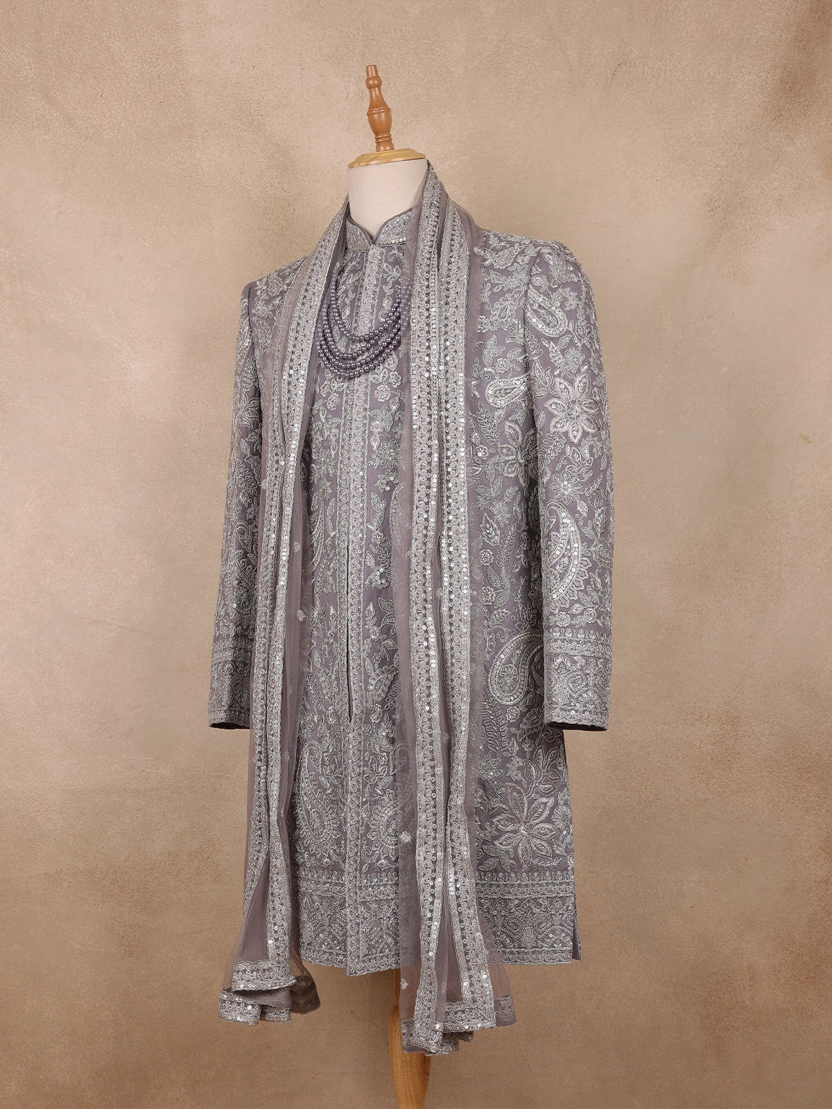Lilac Grey Floral And Paisley Embroidery Net Sherwani Suit