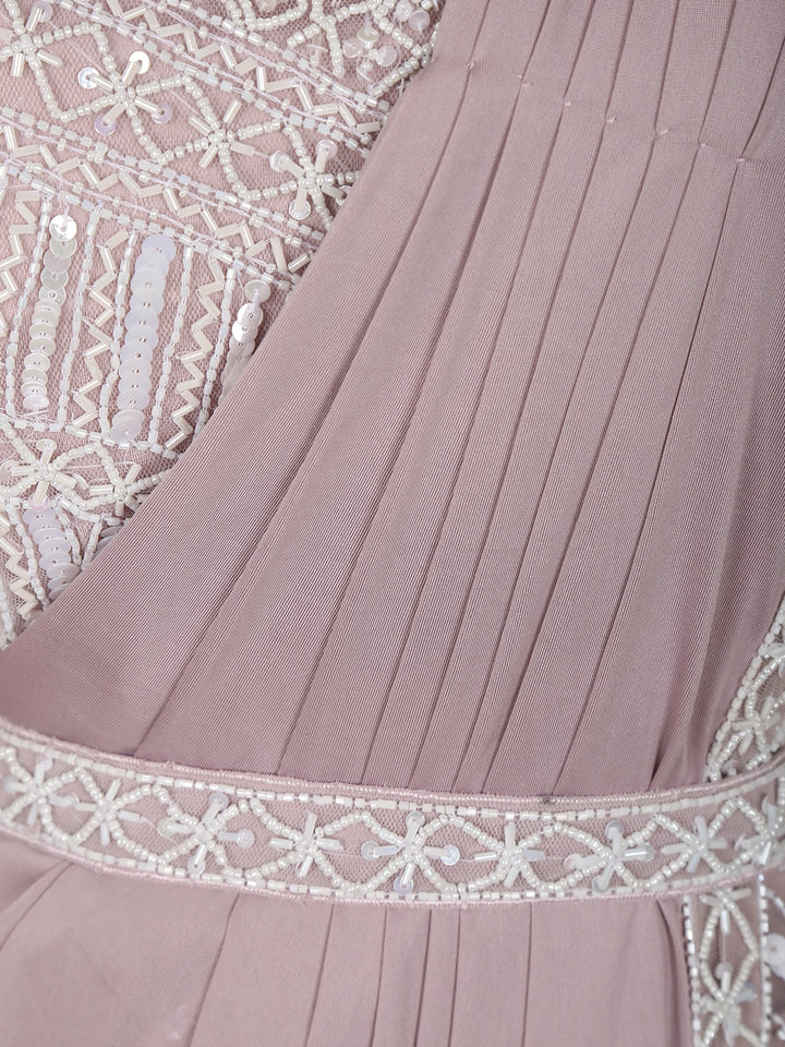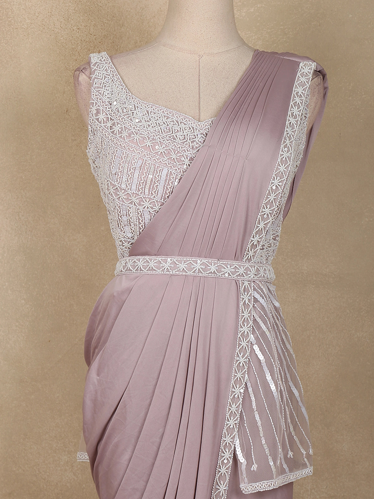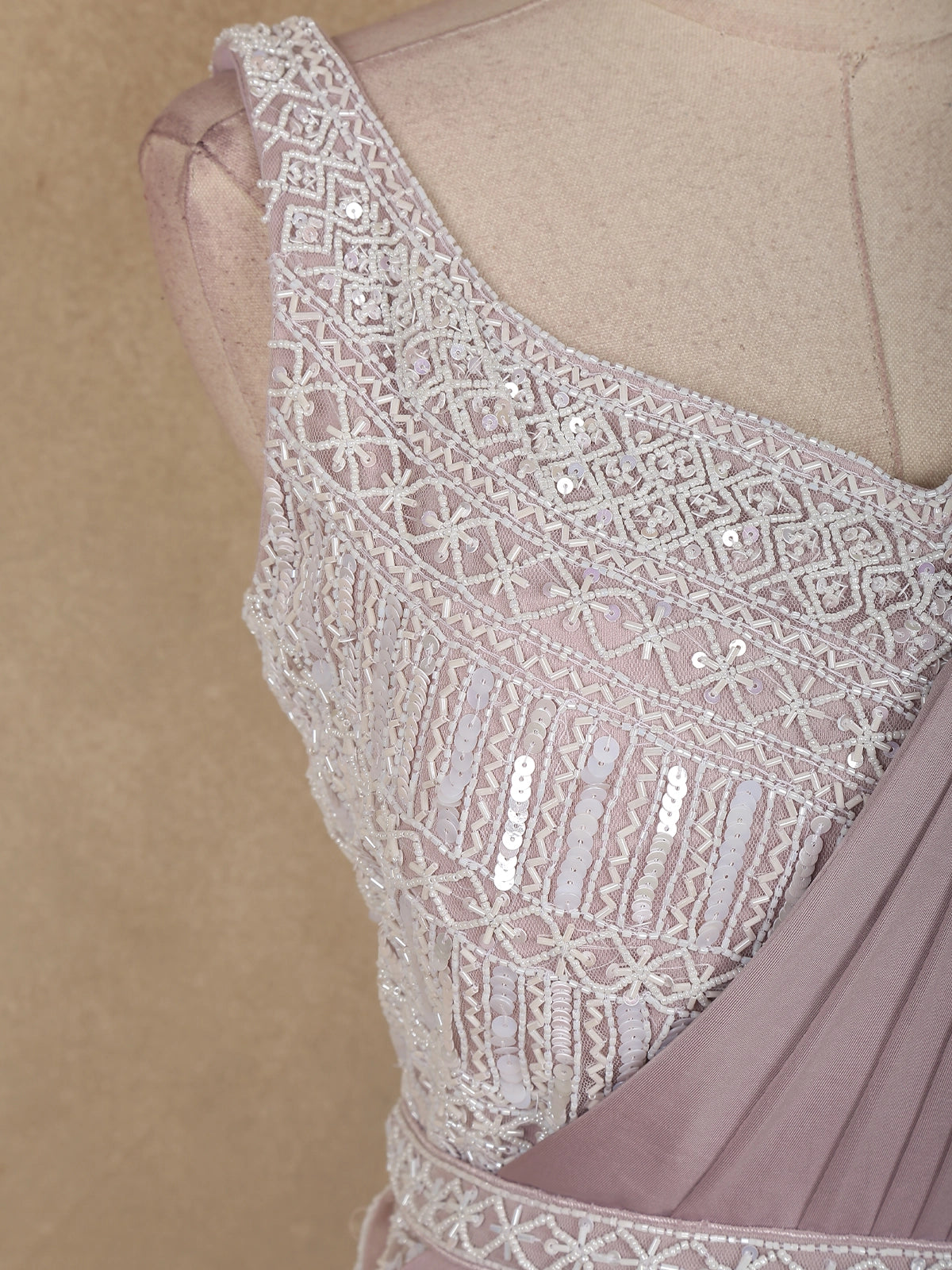 The pre-stitched design ensures effortless draping — perfect for those who desire the beauty of a saree without the hassle of pleating. The blouse is adorned with intricate sequin and bead embroidery, forming delicate floral and geometric patterns that shimmer under every light. Its sleeveless cut and gracefully curved neckline lend a refined, contemporary touch.