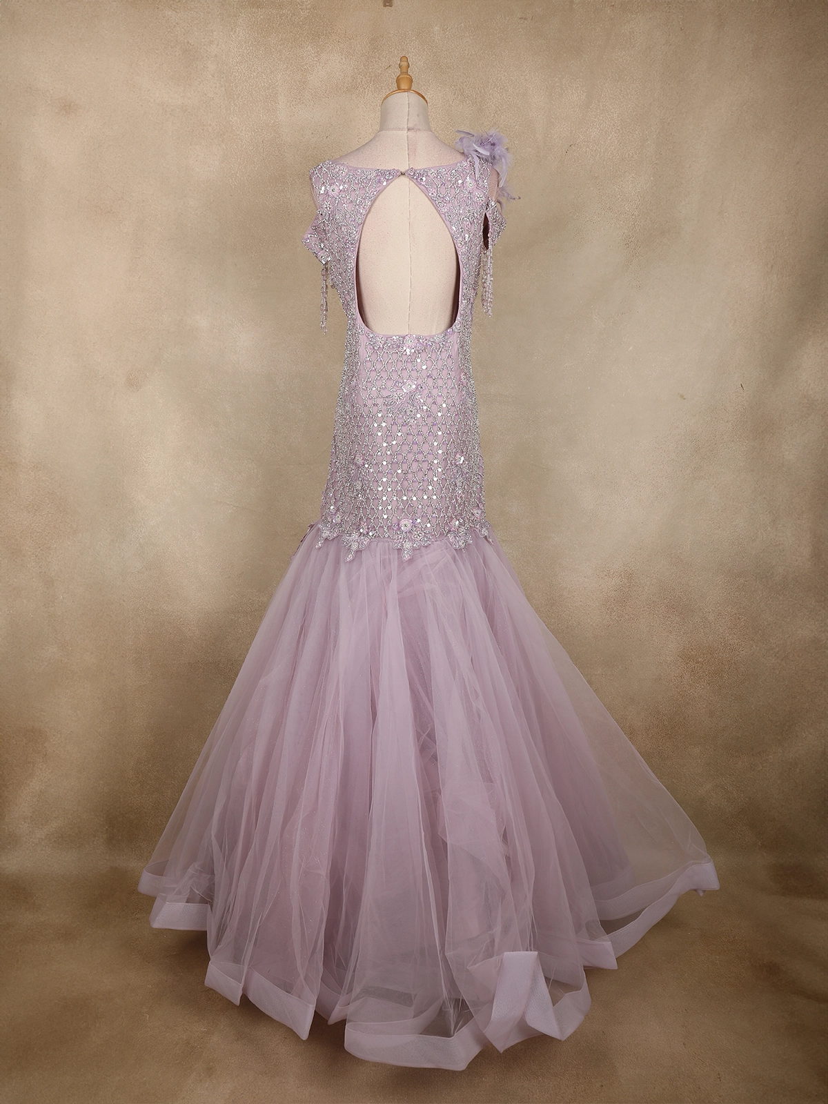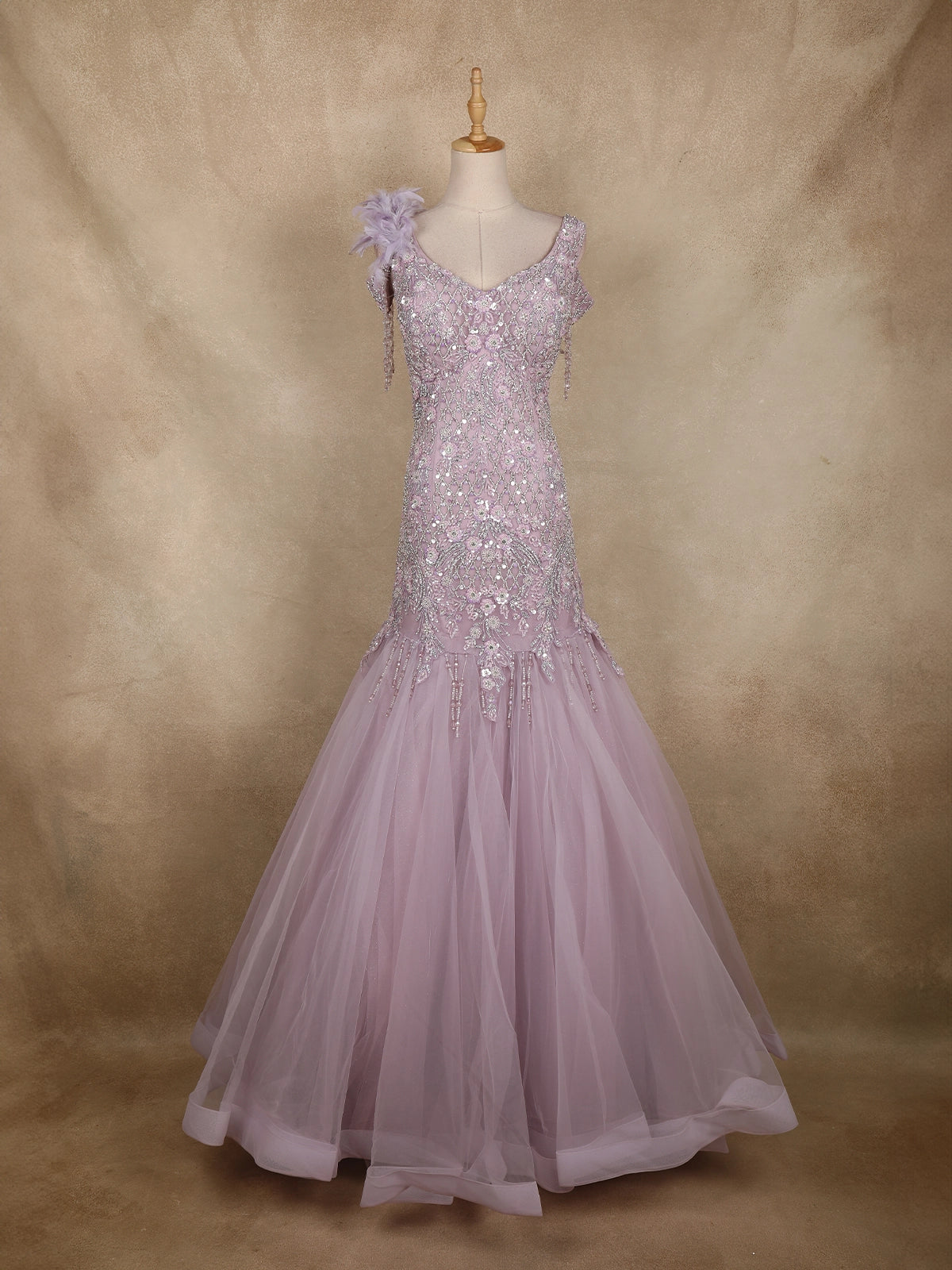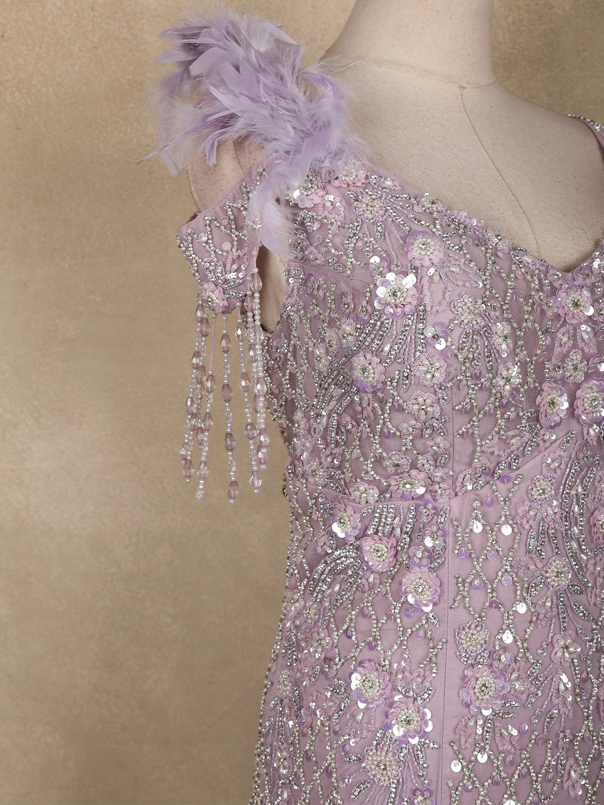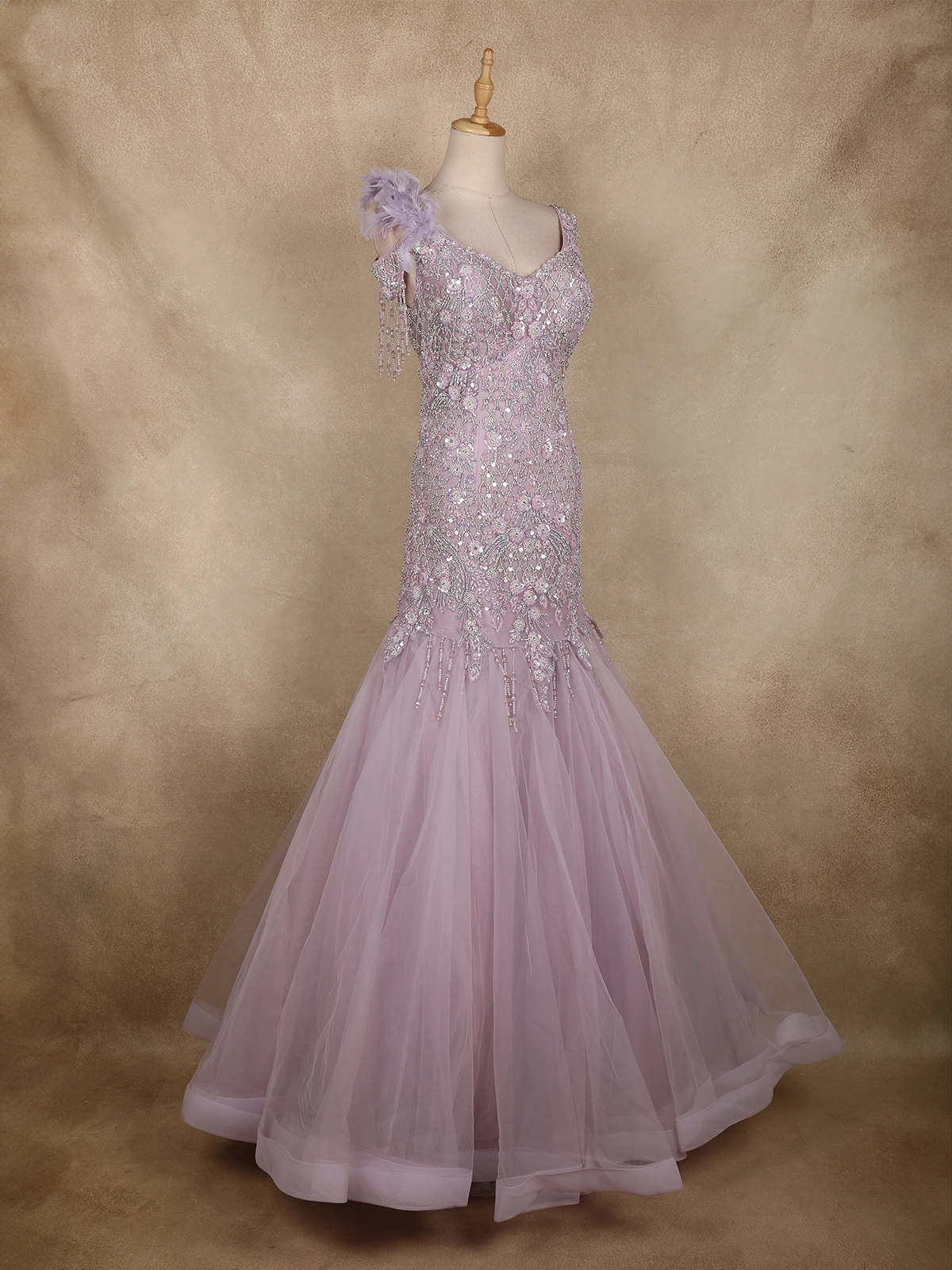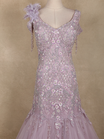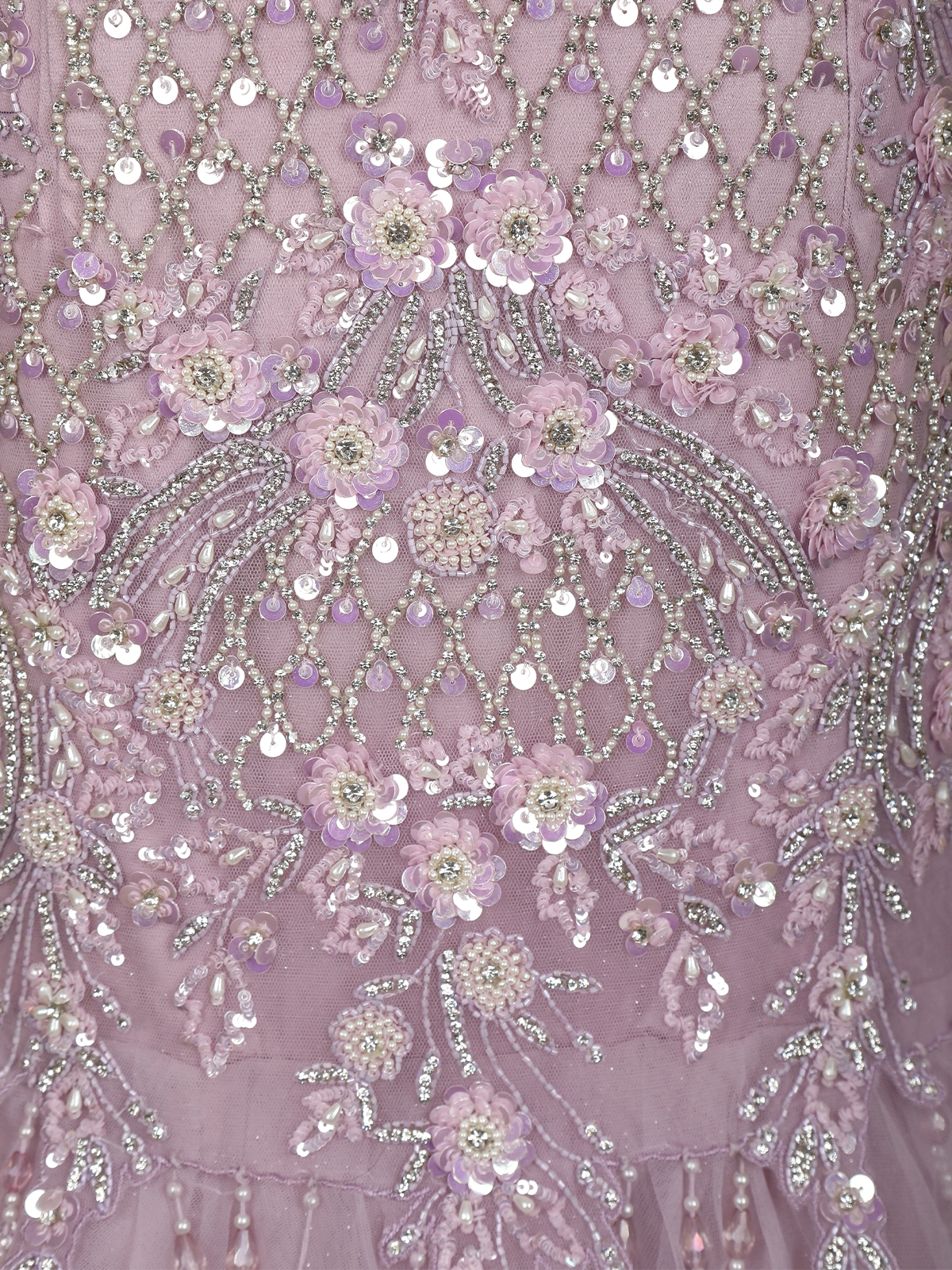 Rendered in a soft pastel lilac hue, this ensemble perfectly balances delicacy and grandeur — making it an impeccable choice for receptions, red-carpet events, and grand evening occasions.