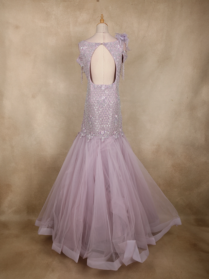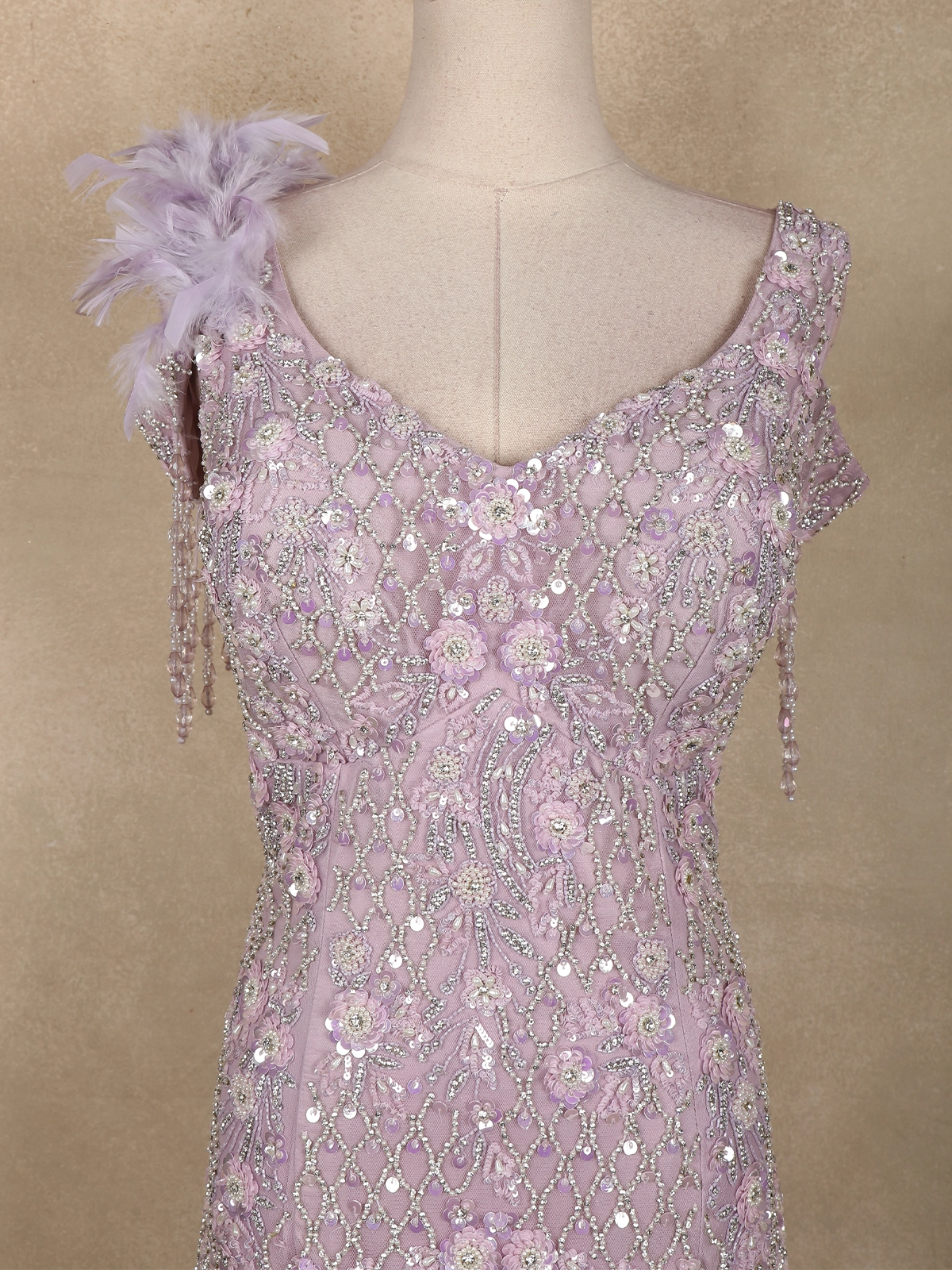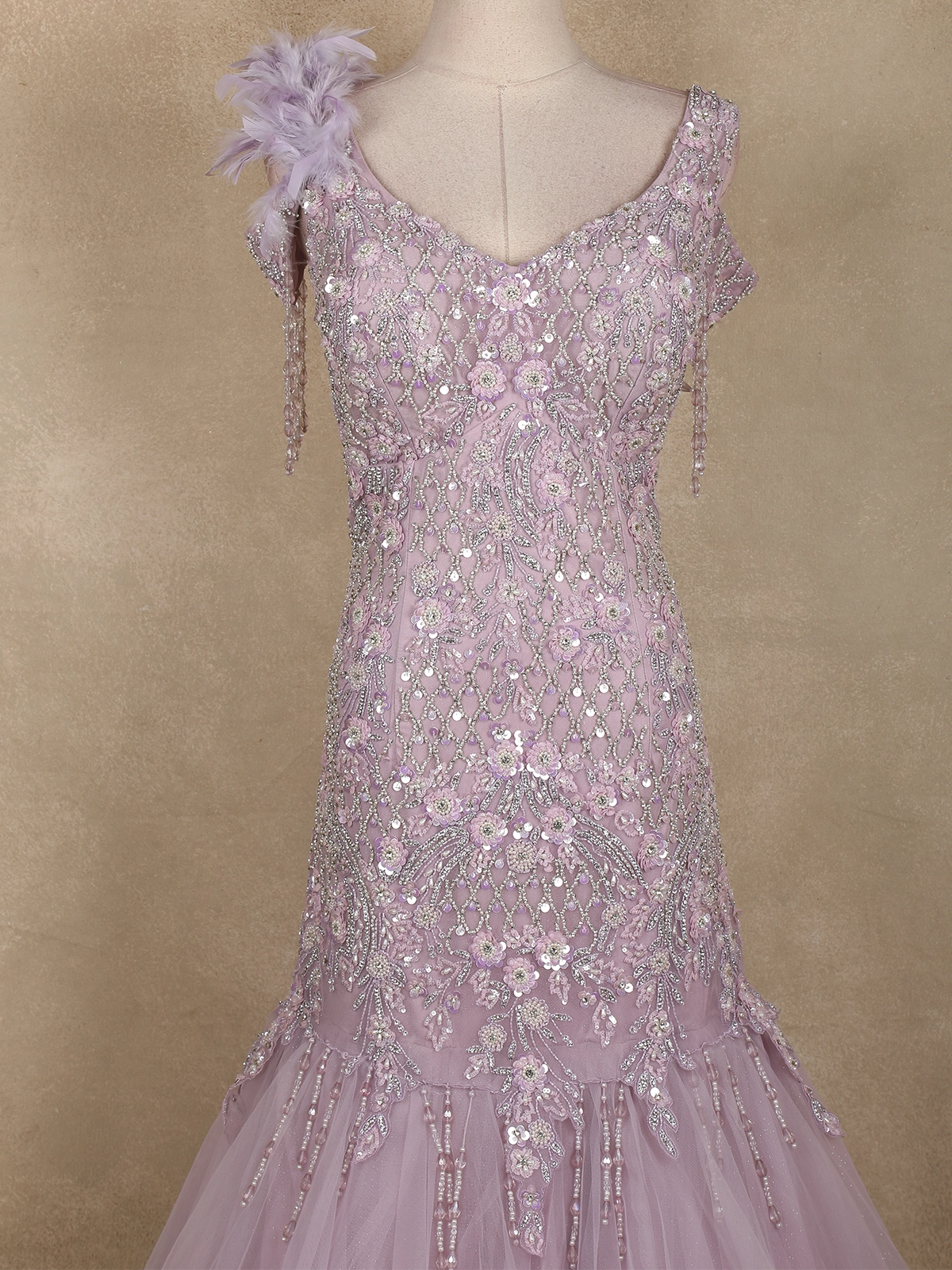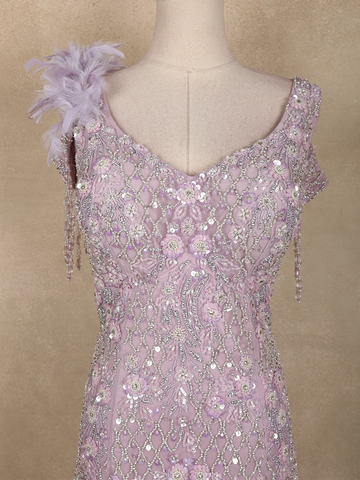 Lilac Sequins and Beads Embellished Design Net Mermaid Gown with Feather Shoulder Detail