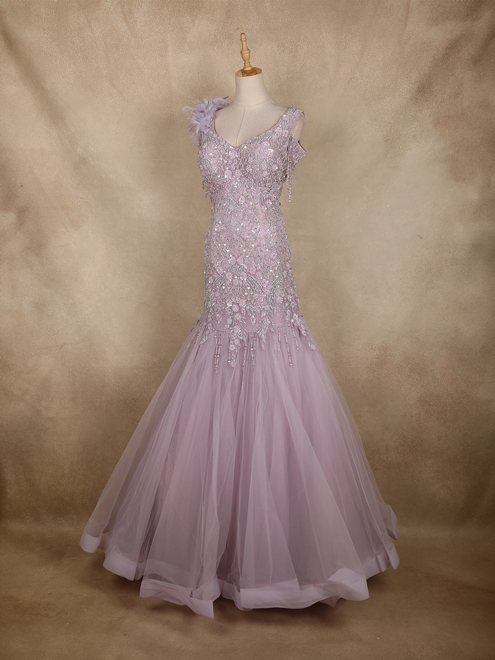 Step into a world of ethereal charm with this Lilac Sequins and Beads Embellished Net Mermaid Gown, designed to exude elegance, luxury, and timeless beauty. Crafted from delicate net fabric, the gown features hand-embroidered sequins, beads, and crystal embellishments that glimmer gracefully across the bodice and cascade down the silhouette, creating a dazzling, sculpted effect.