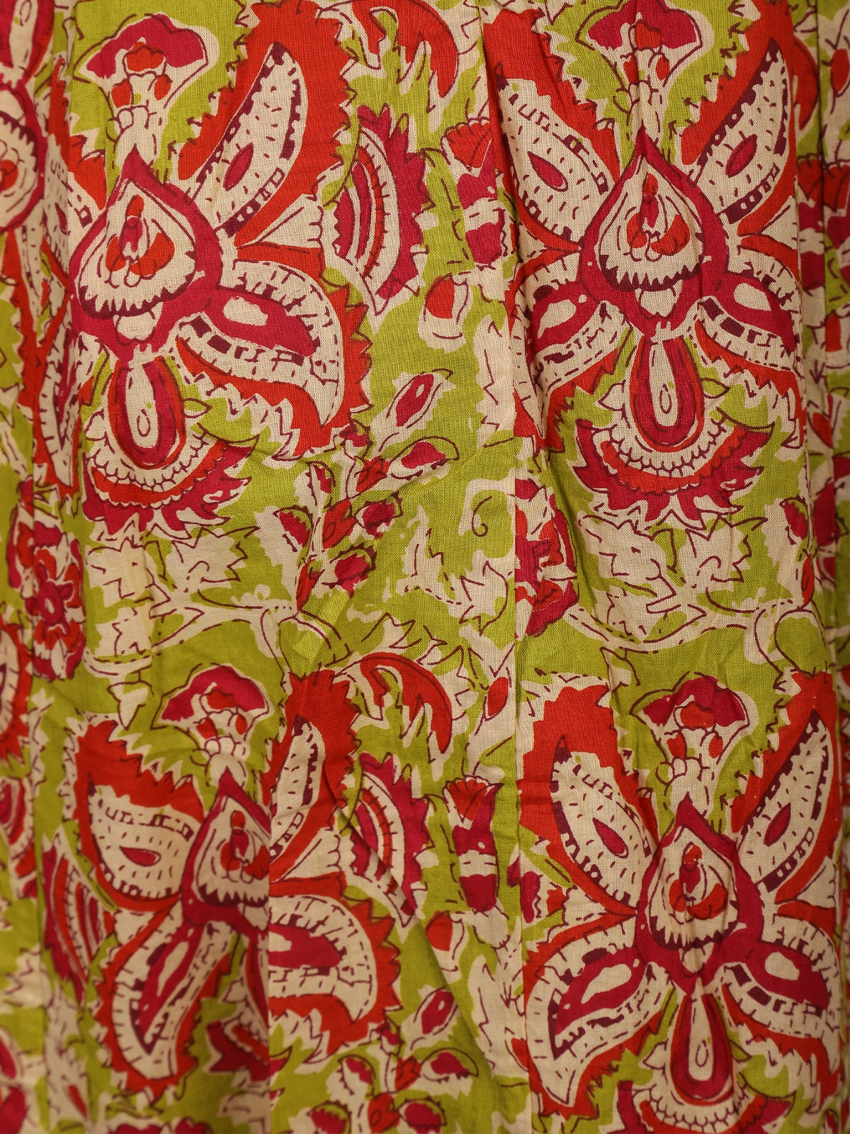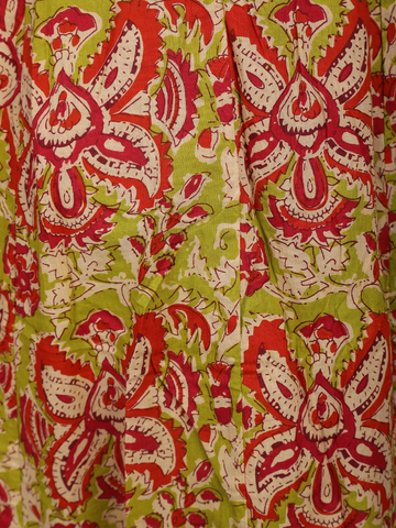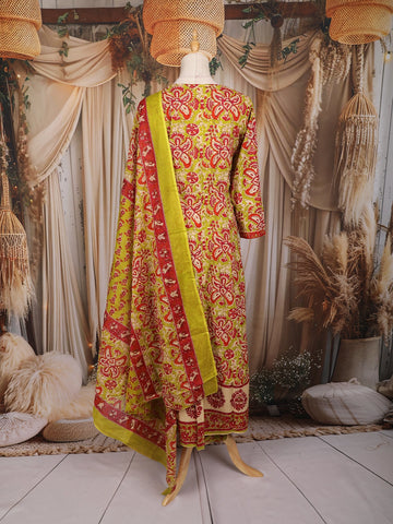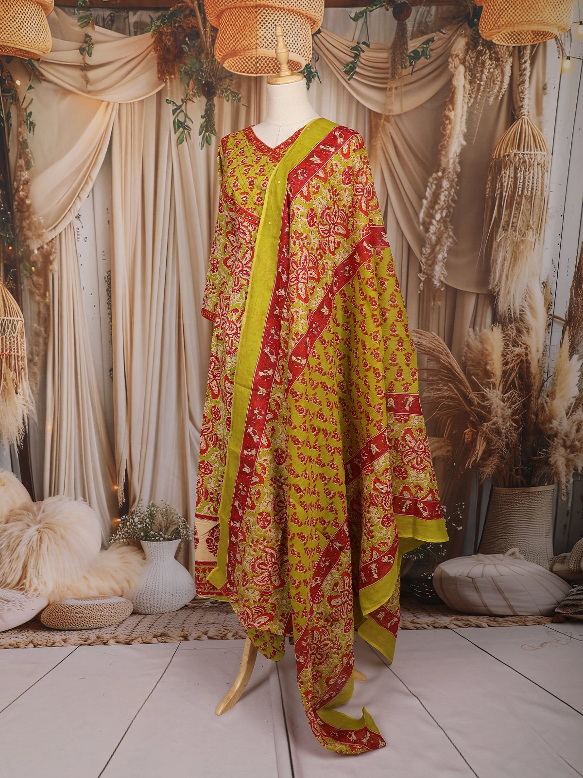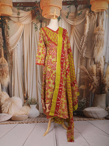Lime Green and Red Floral Printed Cotton Salwar Suit with Dupatta