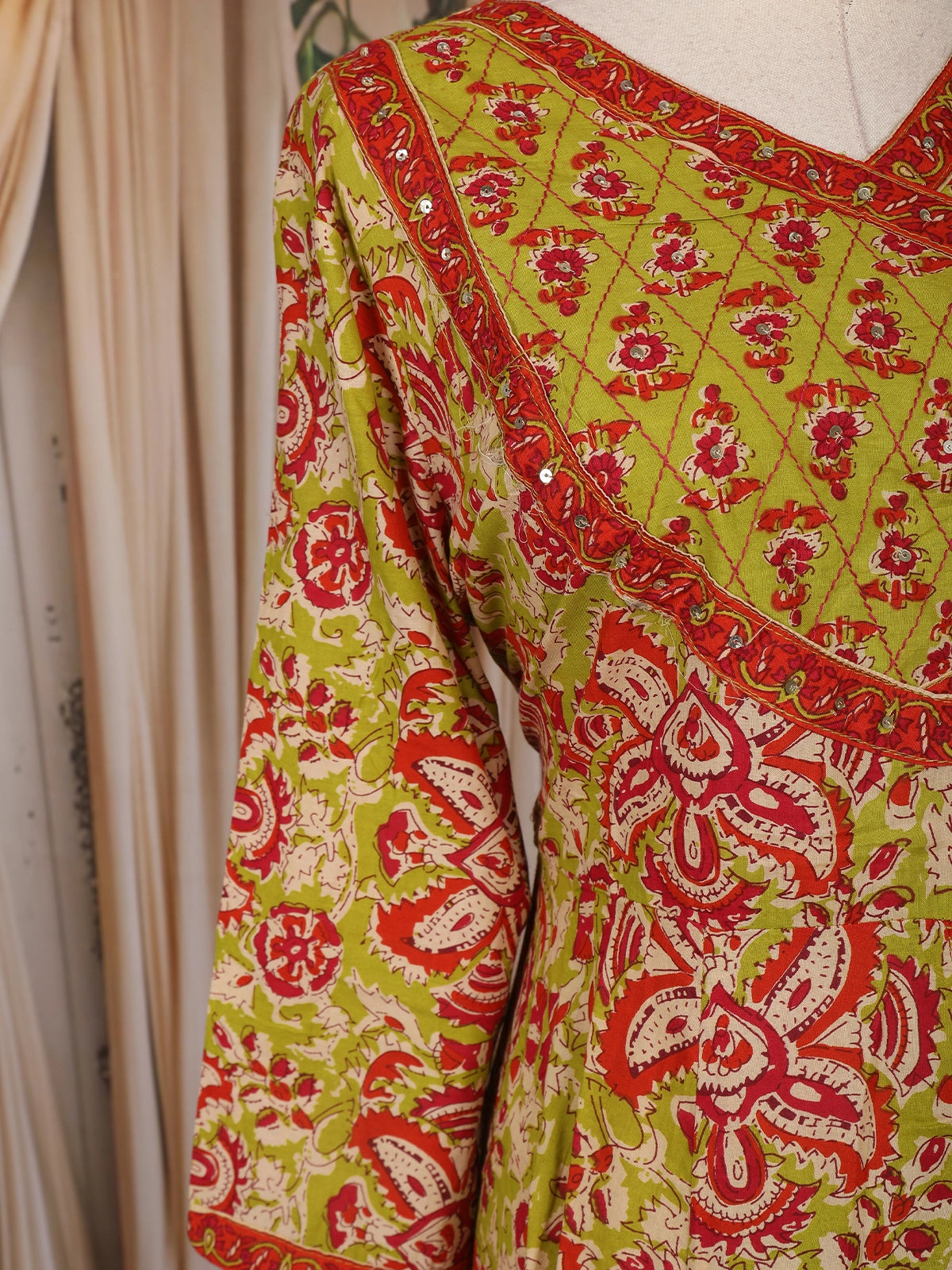 Bright, bold, and effortlessly beautiful — this lime green cotton Anarkali suit is a celebration of vibrant ethnic style. The outfit features a stunning floral and geometric block print pattern in striking shades of red and ivory, enhanced with sequin and thread embroidery on the neckline for a touch of shimmer. The flattering wrap-style V-neck and flared silhouette add grace and flow, while the matching printed dupatta with red border detailing completes the ensemble with traditional elegance.