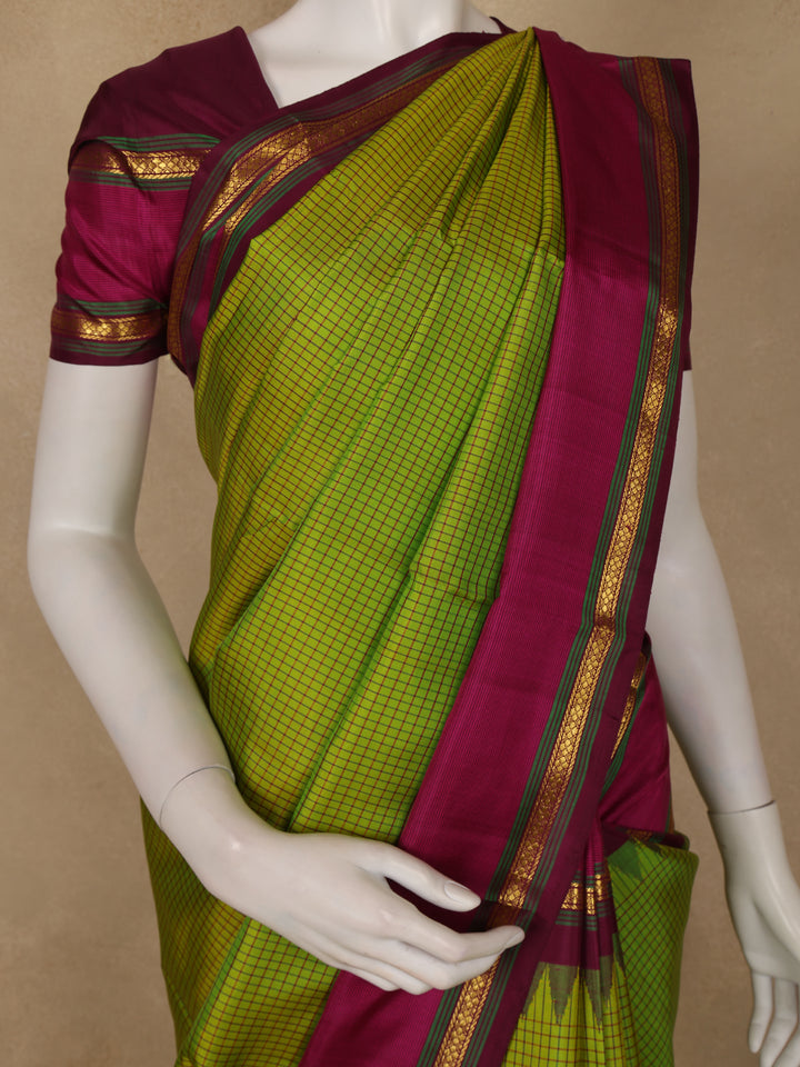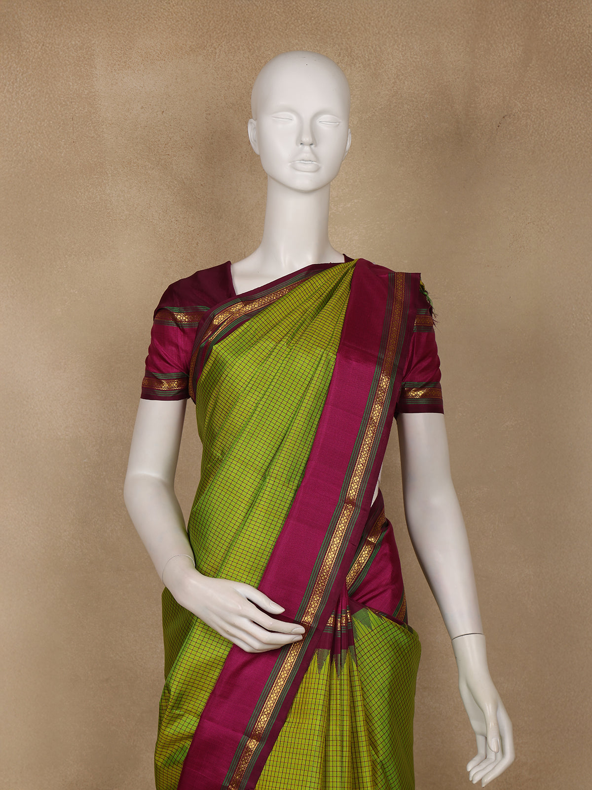 This Lime Green Checked Pure Kanchipuram Silk Saree embodies traditional South Indian craftsmanship with a rich and regal touch. The body features fine black checks on a vibrant lime green base, adding a graceful geometric charm. A contrasting wine maroon border and pallu accentuate the drape with intricate gold zari weaves, infusing timeless grandeur. The lush pallu showcases traditional striped zari patterns, lending a festive appeal ideal for weddings and cultural celebrations.