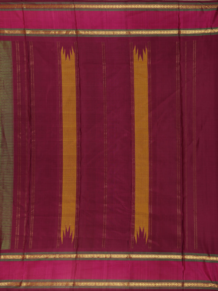 Crafted from luxurious pure Kanchipuram silk, this saree offers a perfect combination of sheen, durability, and drape. Pair it with traditional temple jewelry to complete your classic festive look.
