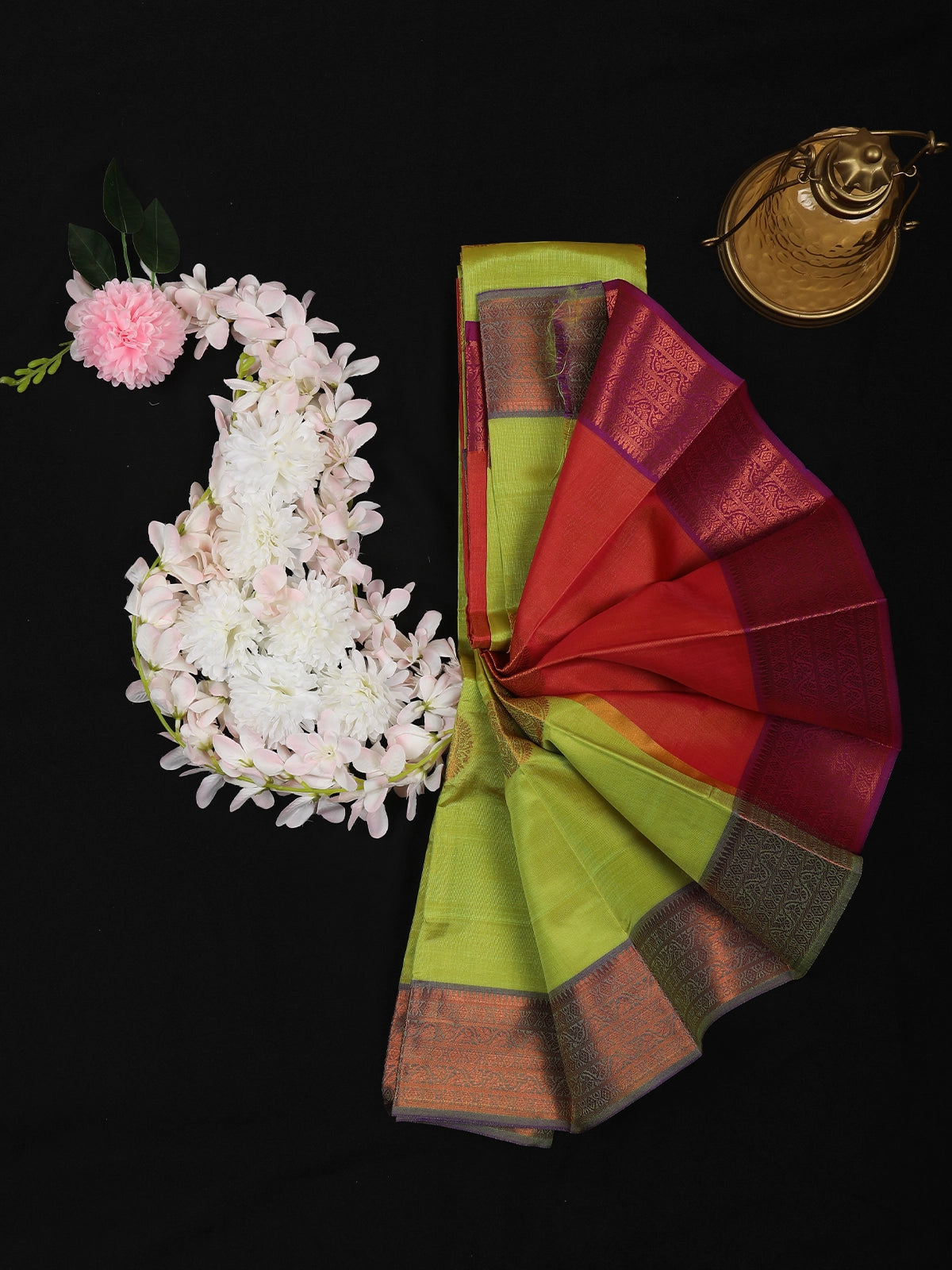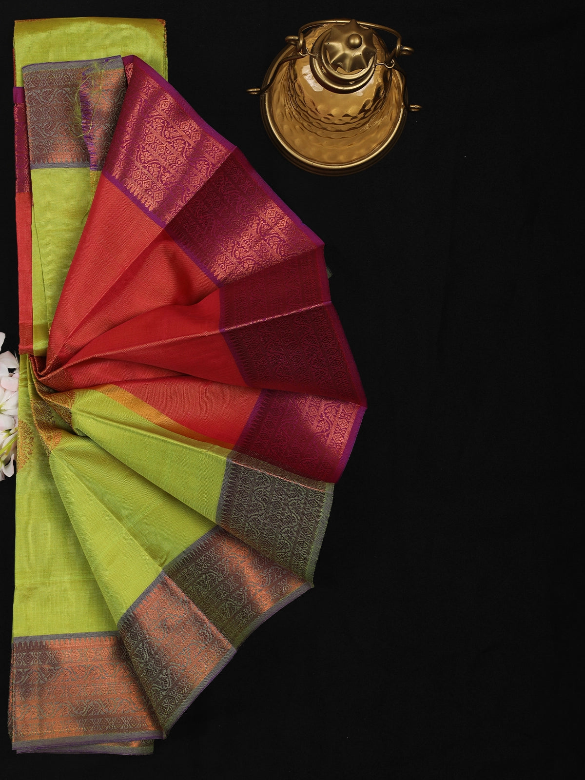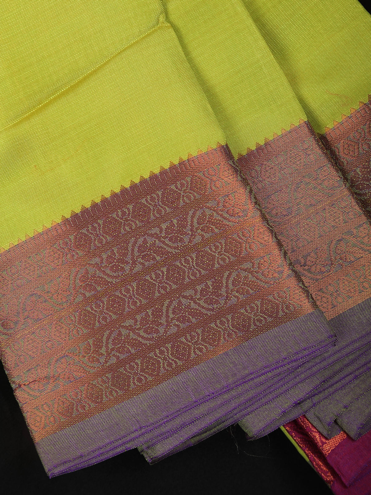 The saree is beautifully framed with a contrast purple zari border, intricately woven with traditional patterns that add depth and a striking visual contrast. The zari work lends a regal touch, making this saree ideal for festive celebrations, temple occasions, and family functions. Completing the look is a coordinated pallu that highlights the craftsmanship and elevates the overall elegance of the drape.