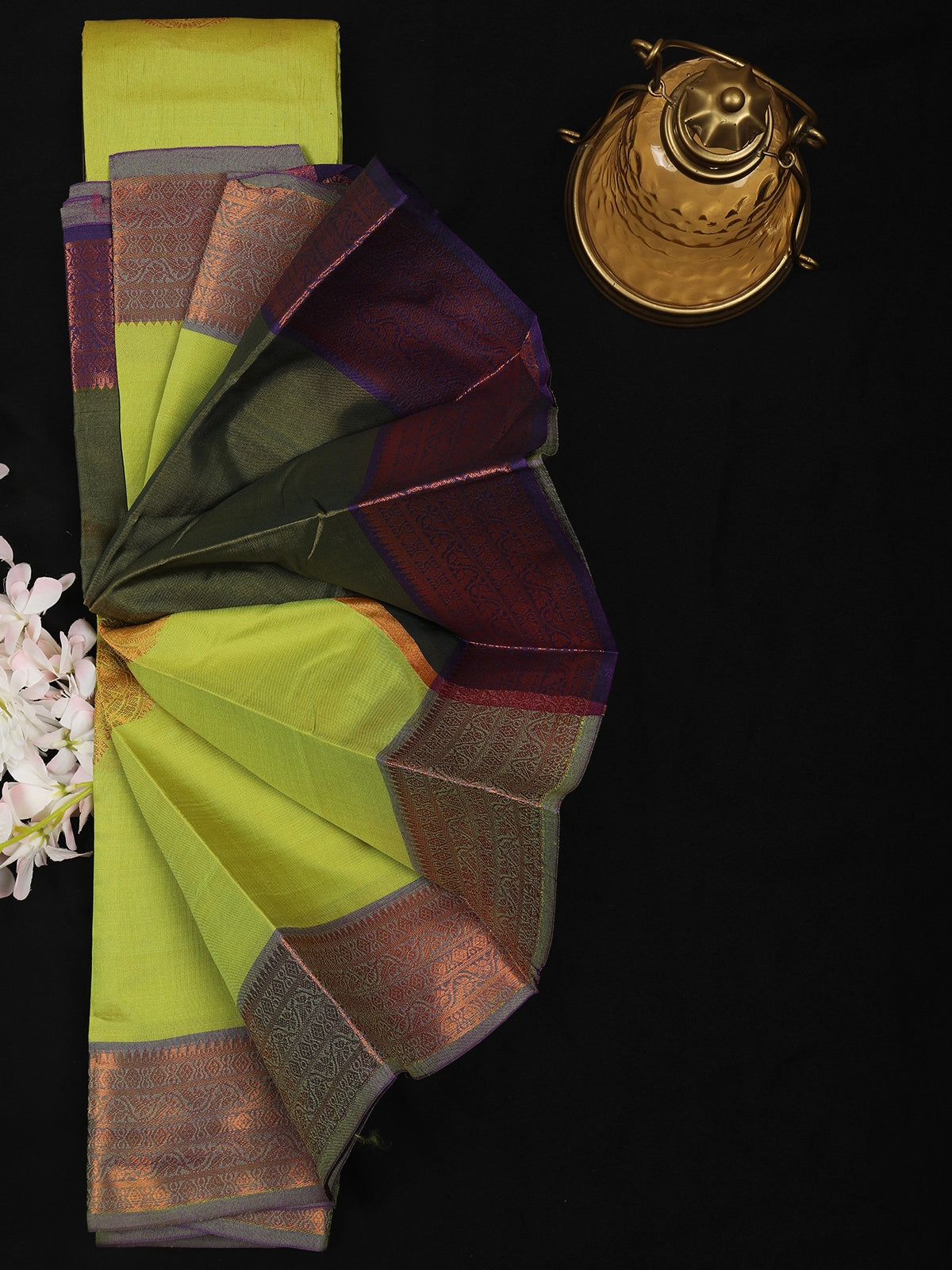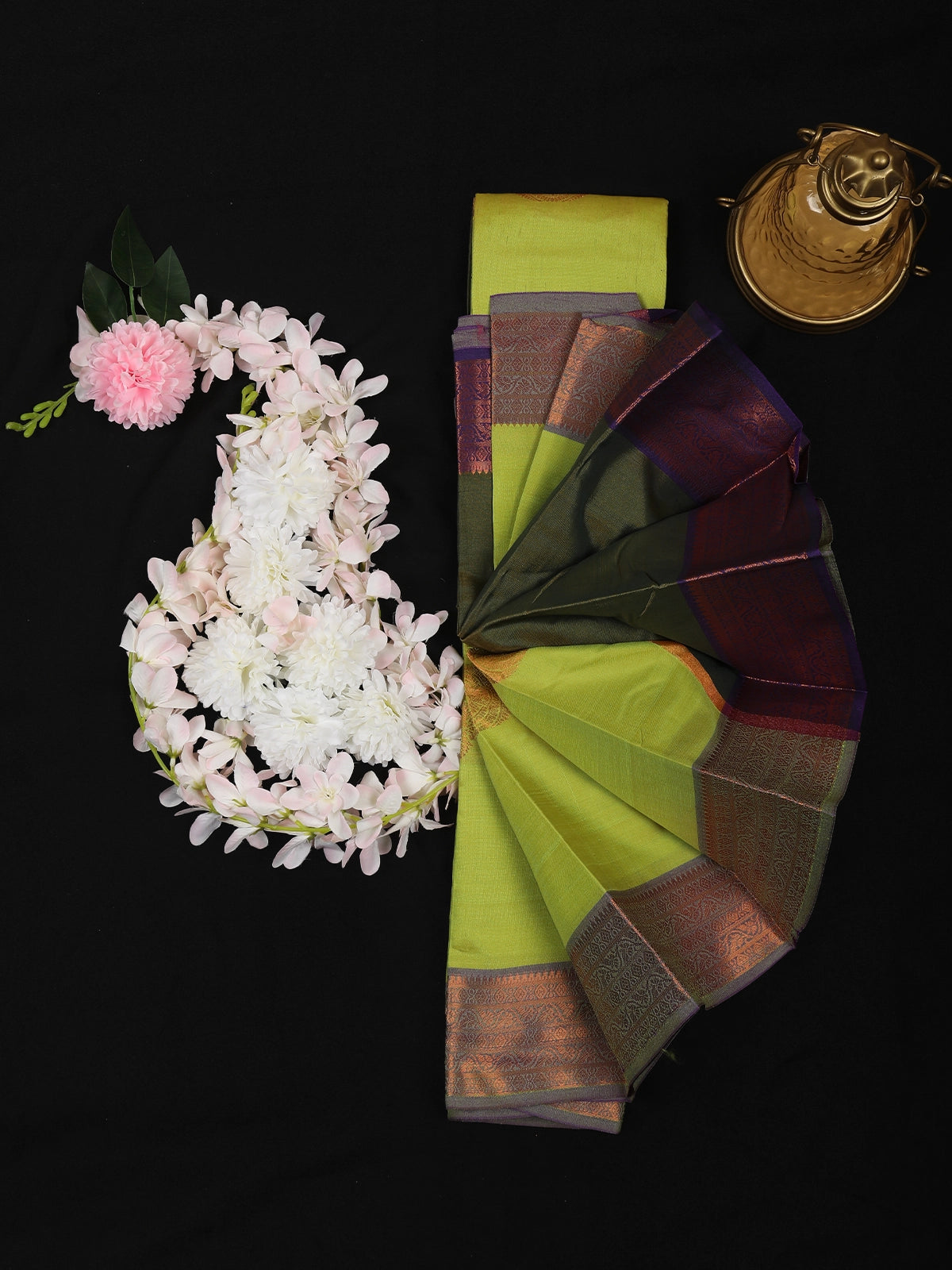 The saree is beautifully enhanced with a rich contrast purple zari border, intricately woven with traditional patterns that add depth and grandeur to the overall design. The pallu continues the classic artistry with coordinated zari weaving, reflecting skilled craftsmanship and heritage detailing. The striking contrast of lime green and purple creates a graceful balance of brightness and richness.