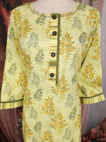 Infuse your wardrobe with a refreshing touch of elegance with this Lime Green Cotton Salwar Suit, designed in soft, breathable fabric that’s perfect for everyday comfort. The suit features a delicate floral print in tones of mustard and green, lending a soothing yet vibrant appeal.