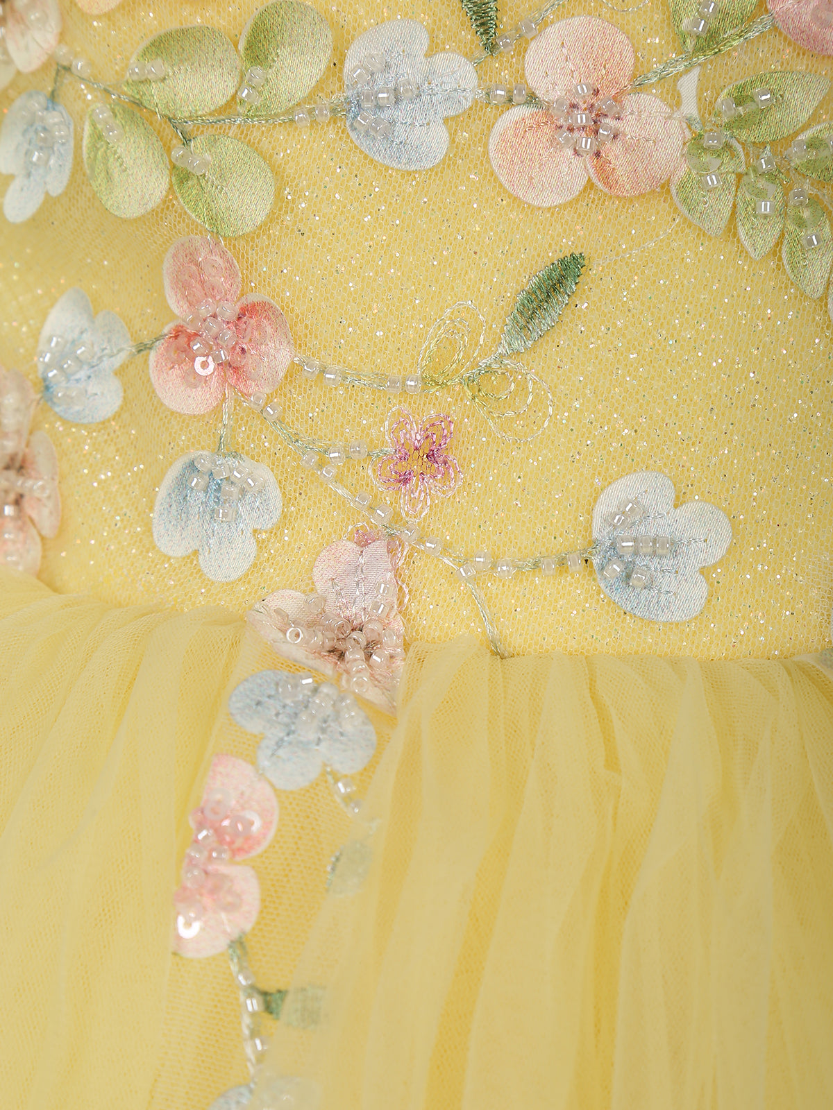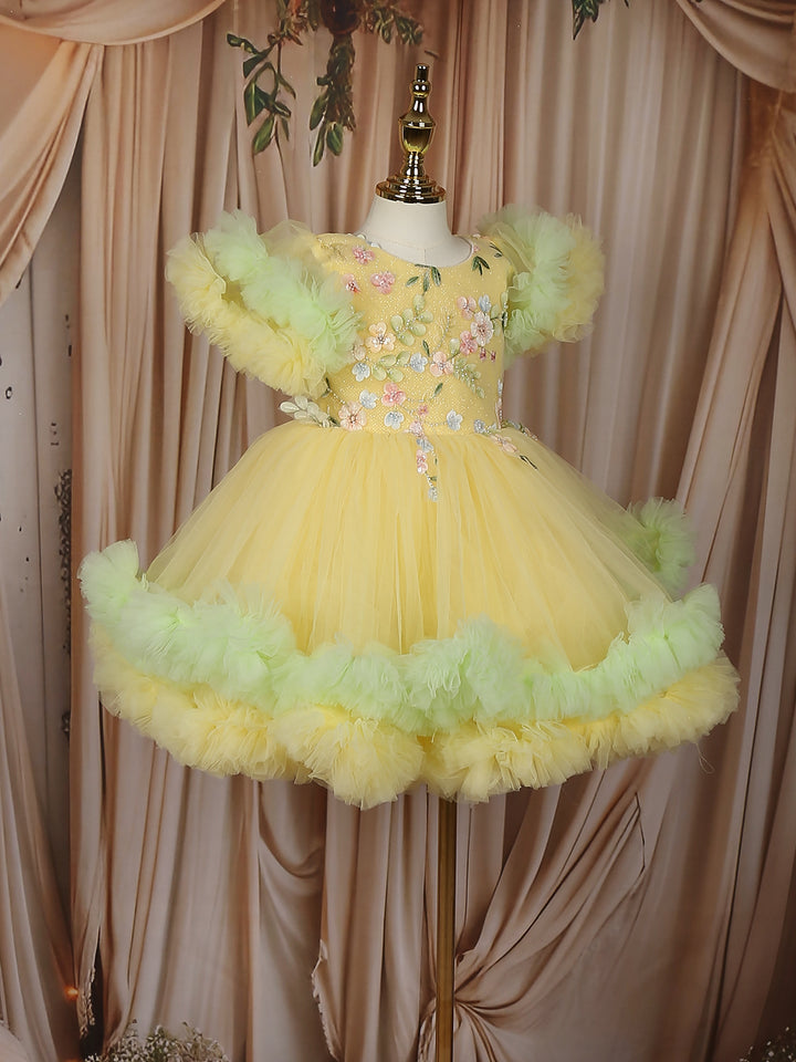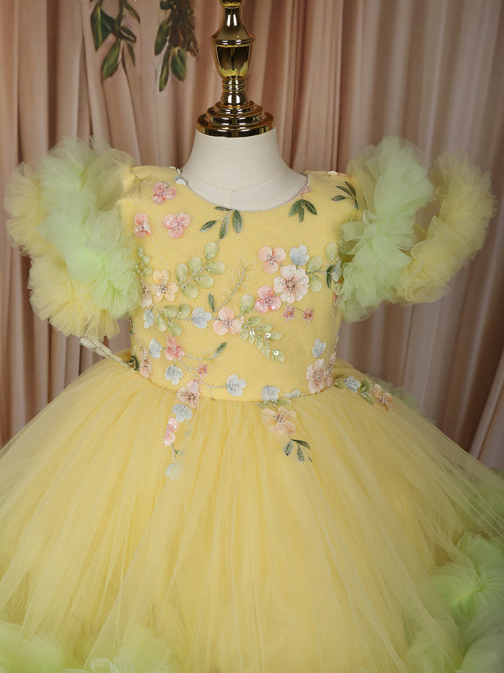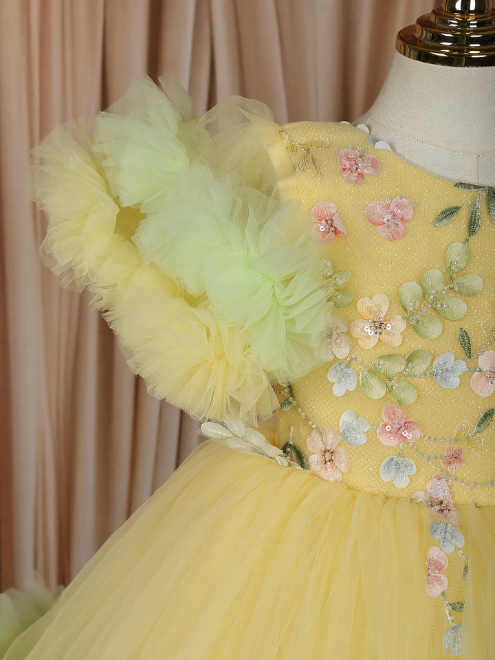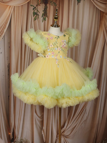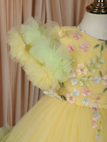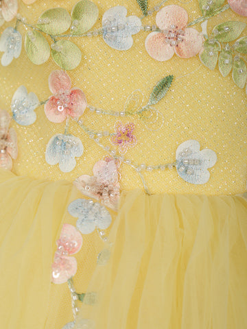 Let your little one twirl in charm and sweetness with this enchanting lime yellow party wear frock. Designed with soft layers of net that create a full and fluffy flare, this dress brings fairy-tale elegance to every step. The bodice is beautifully embellished with pastel floral applique and delicate bead detailing, adding a touch of dreamy sophistication.