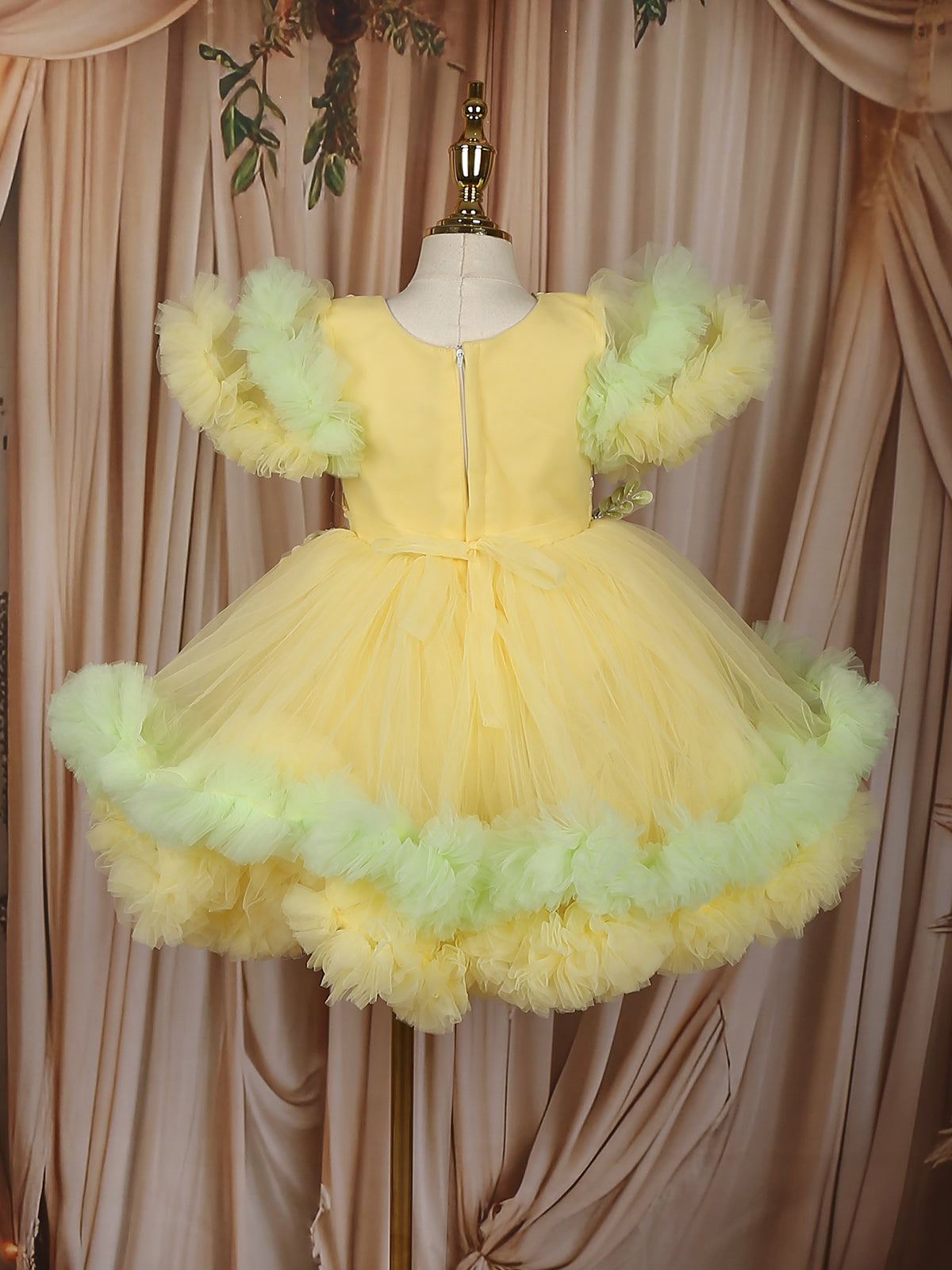 The puffy ruffle sleeves add volume and playfulness, perfectly complementing the frothy hemline that blooms with layered net ruffles. The inner cotton lining ensures comfort, making it easy for your child to move, play, and shine throughout the celebration.