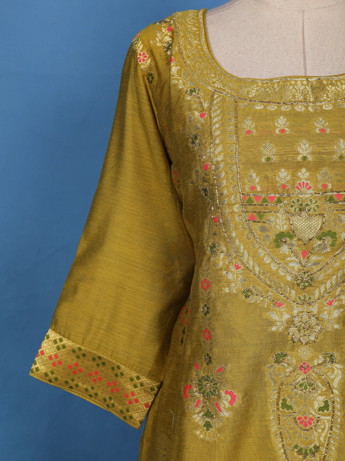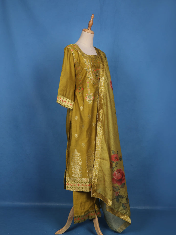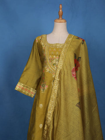 Step into effortless elegance with this Lime Yellow Floral Design Silk Salwar Suit, crafted to radiate festive charm. The luminous silk fabric drapes beautifully, reflecting a subtle sheen that enhances its graceful silhouette. Intricate floral motifs, woven or embroidered across the body, lend a touch of timeless artistry to the ensemble.