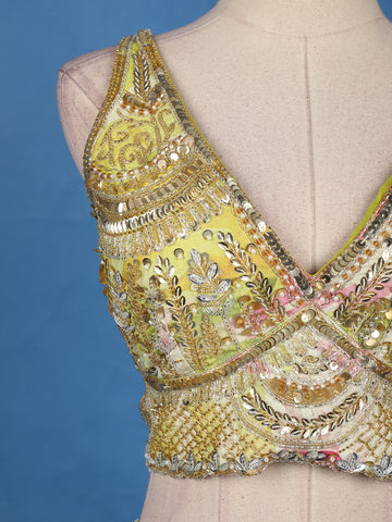 Radiate festive brilliance in this breathtaking Lime Yellow Floral Mirror Embroidered Tissue Lehenga, a perfect fusion of elegance and glamour. Crafted from luxurious tissue fabric with a crushed texture, this lehenga beautifully reflects light, giving you a radiant, ethereal glow.