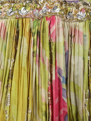 Lime Yellow Floral Mirror Embroidered Design Tissue Crushed Lehenga With Dupatta