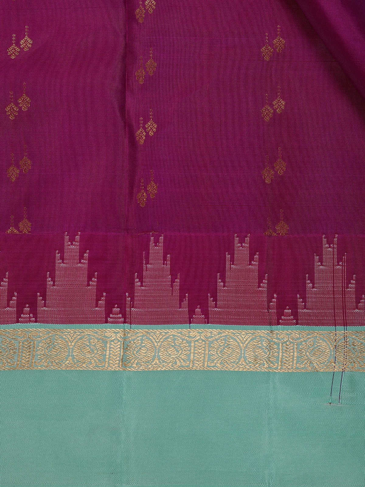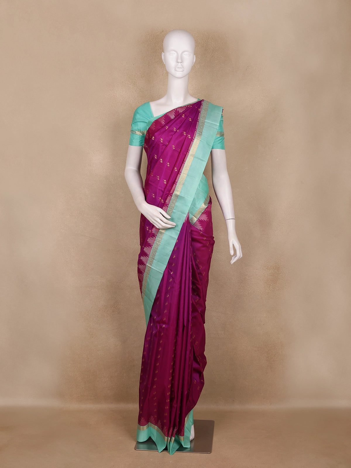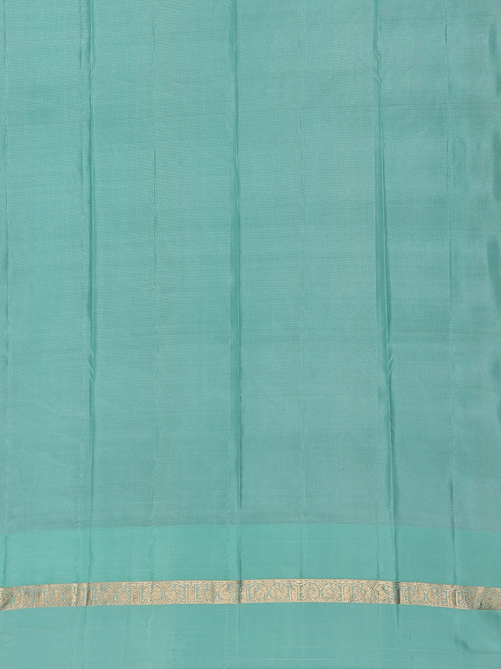 The saree’s broad golden zari border enhances its luxurious finish, making it a perfect pick for weddings, festive occasions, or temple celebrations. The exquisite color pairing of magenta and blue symbolizes grace and grandeur — an ideal choice for women who appreciate traditional artistry with a modern allure.