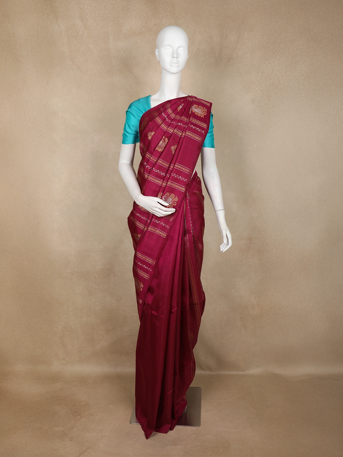 The saree is accentuated with a solid zari border, adding refined richness without overpowering the intricate detailing across the body. With its luxurious finish and timeless craftsmanship, this saree makes the perfect choice for weddings, temple ceremonies, and cultural celebrations.