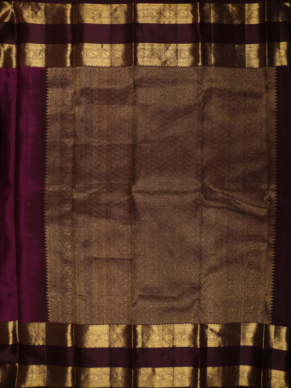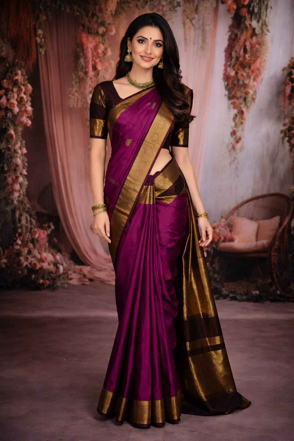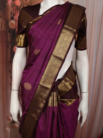 Celebrate timeless elegance with this stunning Magenta Purple Kanchipuram Silk Saree, a perfect blend of traditional craftsmanship and vibrant charm. The rich magenta purple hue exudes regal sophistication, making it an ideal choice for grand festive occasions and wedding celebrations.