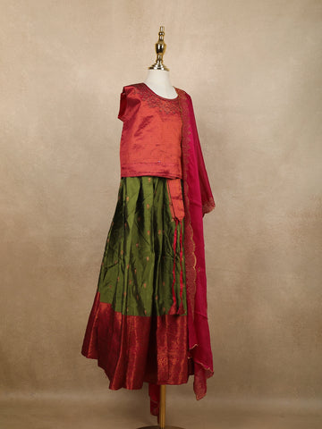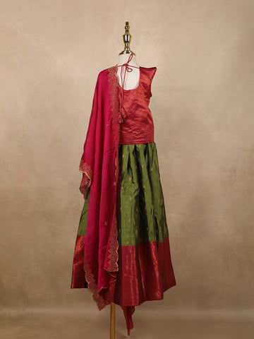 The green Raw silk skirt comes alive with golden zari-woven butta motifs that shimmer gracefully with every twirl. Its broad contrast maroon zari border enhances the regal charm, offering a stunning interplay of traditional hues. Complementing the attire is a matching maroon silk dupatta, adorned with a scalloped zari border and delicate embroidery along the edges — a perfect finishing touch that ties the ensemble together in harmony.