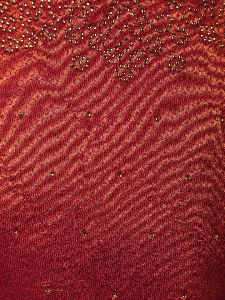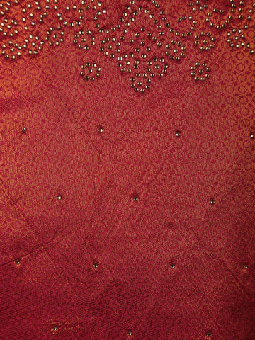 The blouse, rendered in a deep maroon silk fabric, radiates richness with its intricately hand-embroidered beadwork that graces the neckline and shoulder panels. Subtle woven textures add a gentle sheen, while the sleeveless cut gives a modern edge to this classic design.