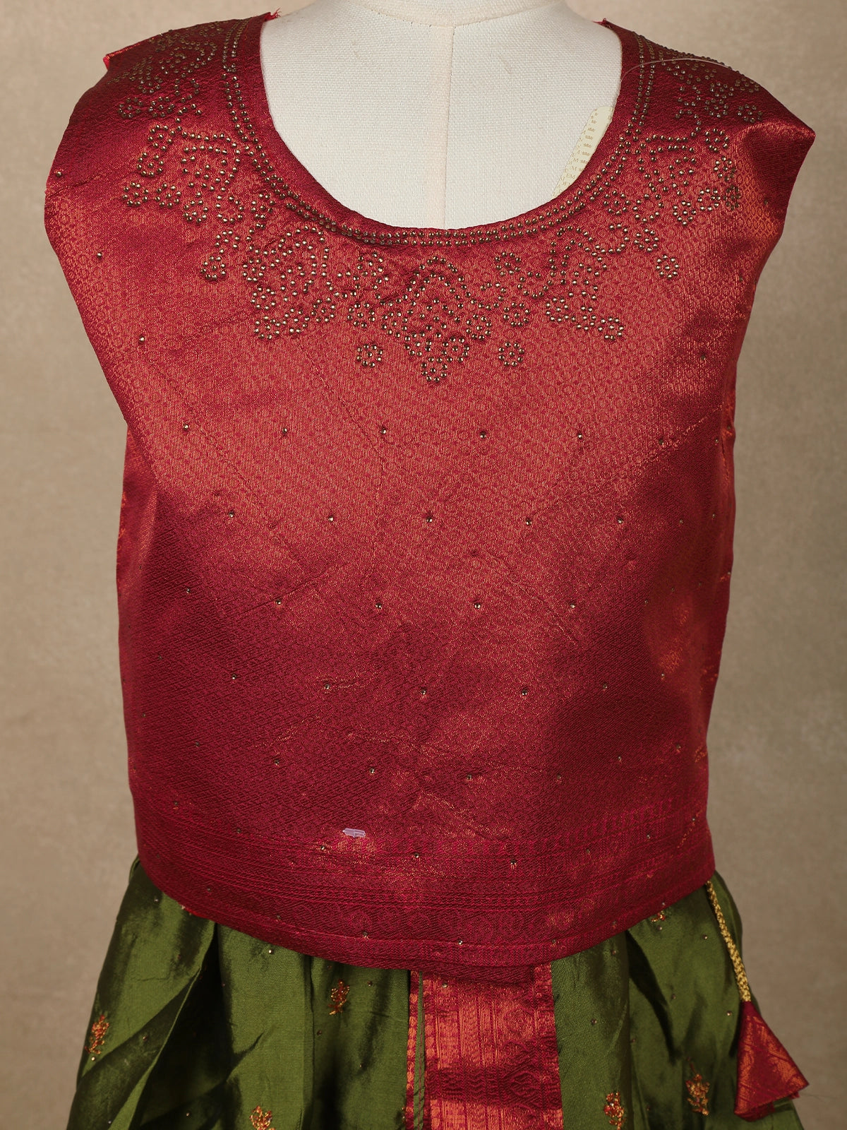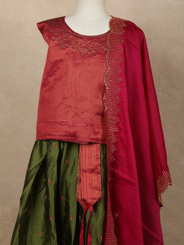 Drape your little one in the timeless elegance of South Indian tradition with this Maroon and Green Embroidered Raw Silk Pattu Pavadai Set, a masterpiece crafted for festive occasions and grand celebrations.